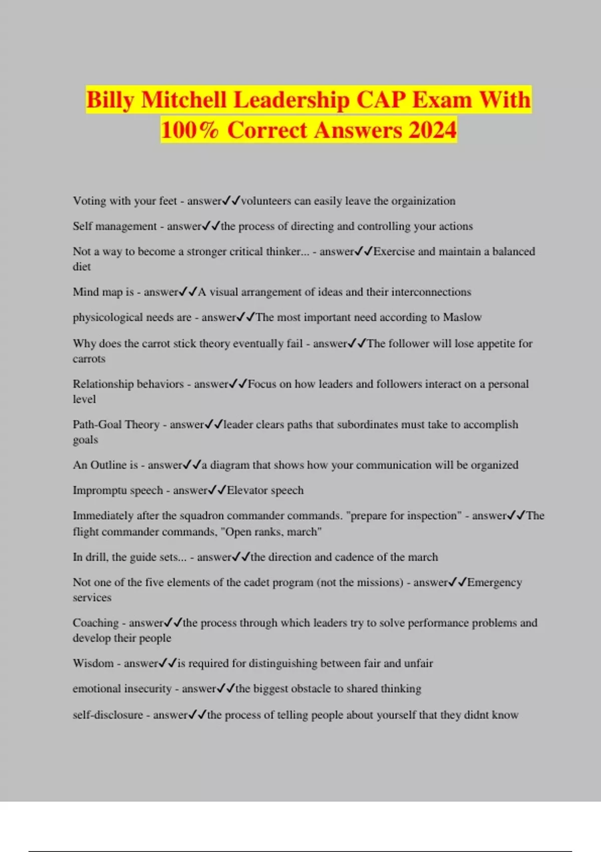 CAP Billy Mitchell Leadership Test Exam With 100% Correct Answers 2024