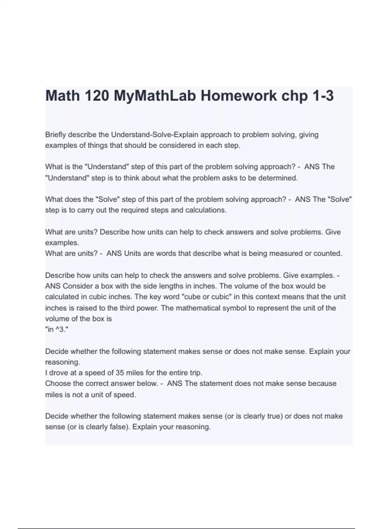 MATH 120: MyMathLab Homework chp 1-3 Exam Questions and Answers (A+ GRADED 100% VERIFIED 2023/2024)