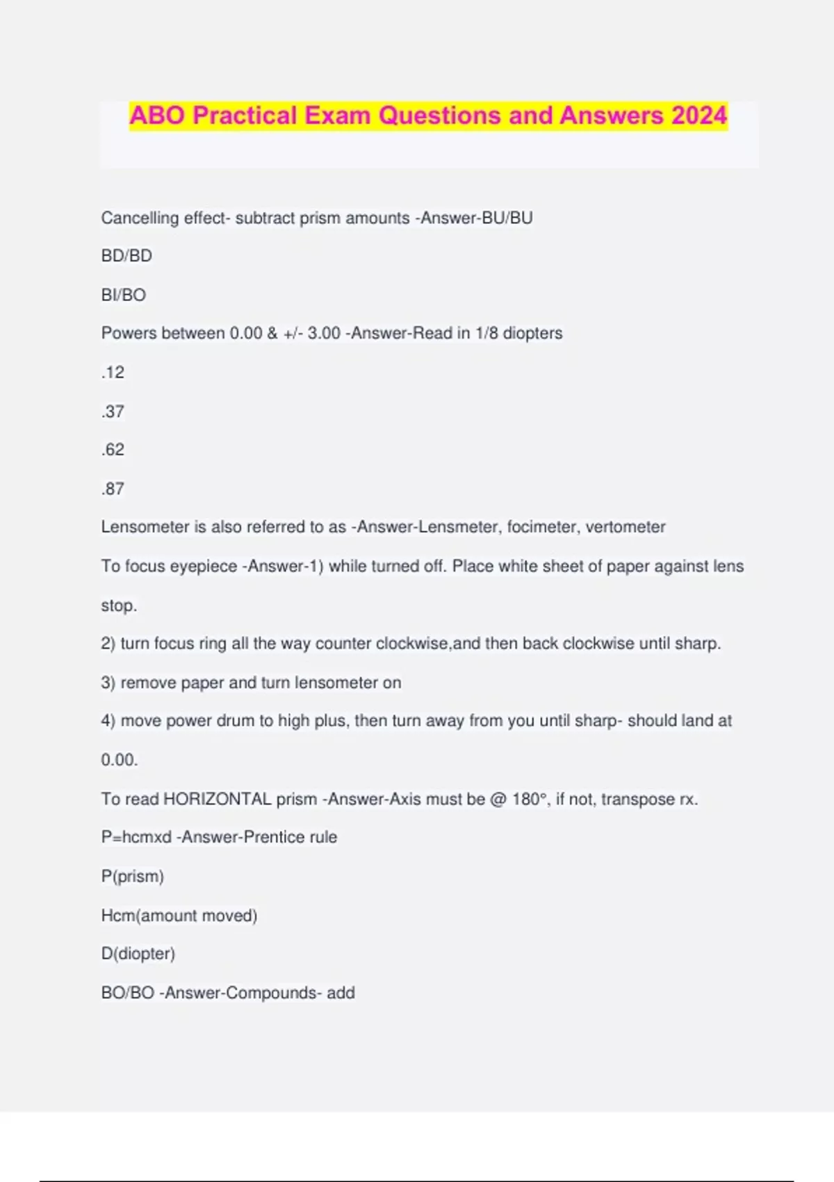 ABO Practical Exam Questions and Answers 2024