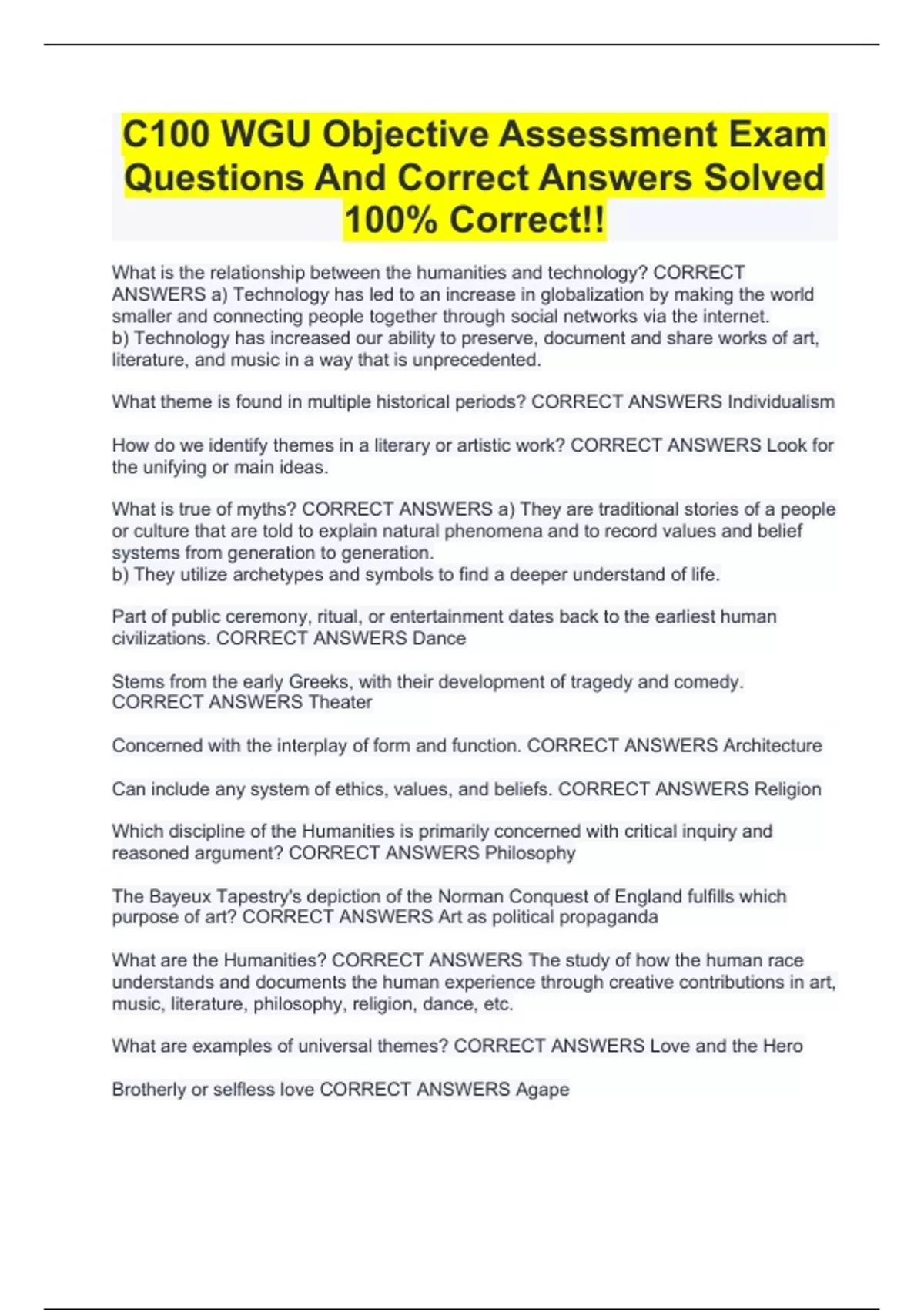 C100 WGU Objective Assessment Exam Questions And Correct Answers Solved 100% Correct!! WGU C100 Humanities FINAL Study Guide | 100% Correct Answers | Verified WGU C100 Introduction To Humanities Rated 100% Correct!!