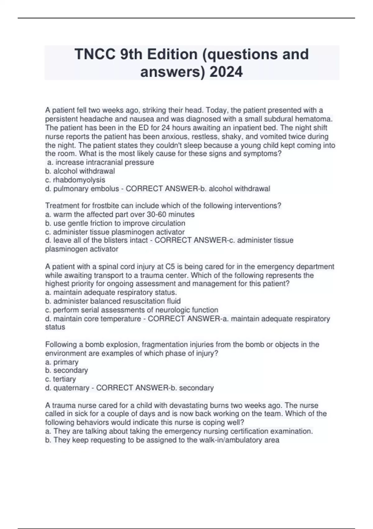TNCC 9th edition 2024 with verified answers Trauma Nursing Process - TNCC 9th Edition final exam TNCC 9th Edition Final Exam 2024 TNCC practice Test Exam Final 2024 TNCC Practice Final Exam 2024 TNCC Final EXAM 2024 Trauma Nursing Core Course (TNCC)- 9th edition 2024 TNCC Written Exam 2024 100% pass TNCC 9th Edition Test exam 2024 TNCC 9th edition