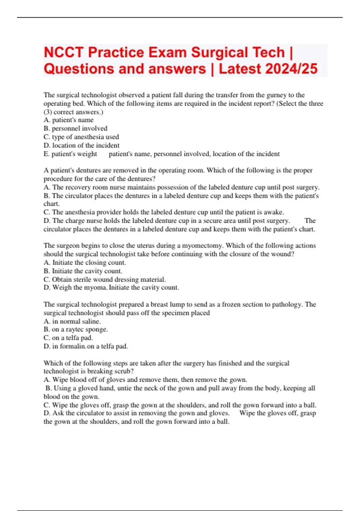 Exam (elaborations) NCCT Practice Exam 2 | 199 questions and answers 2 Exam (elaborations) Intra Operative Care NCCT Practice Exam | With complete solution 2024/25 3 Exam (elaborations) NCCT Surgical Tech Practice | Pre-Surgical Care and Preparation 4 Exam (elaborations) NCCT REVIEW- SURGICAL TECH | Post-Operative Care 2024/25 5 Exam (elaborat