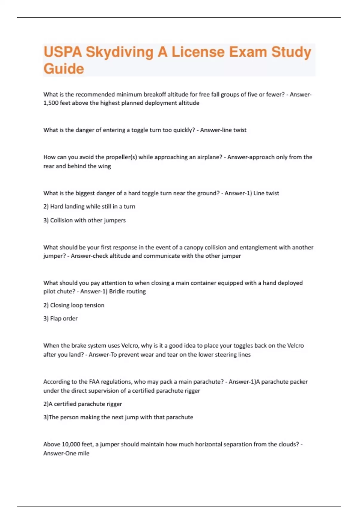 USPA Skydiving B License Study Materials From SIM Questions With 100% Correct Answers.