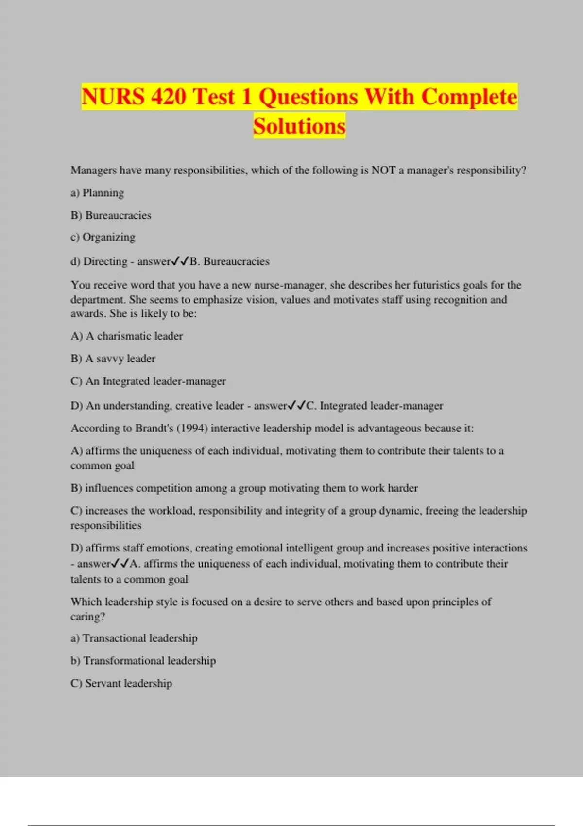 Package deal for NURS 420 Exam Questions with 100% Correct Answers | Verified | Updated