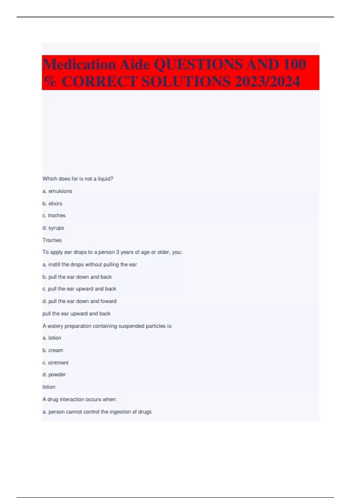 Medication Aide Final Study Guide Exam Questions with Complete Verified Solutions 2024