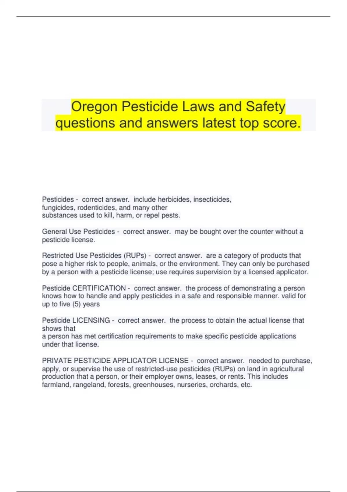 Oregon State Board Practice Exam: Laws & Rules questions and answers.Oregon Pesticide Laws and Safety questions and answers latest top score.