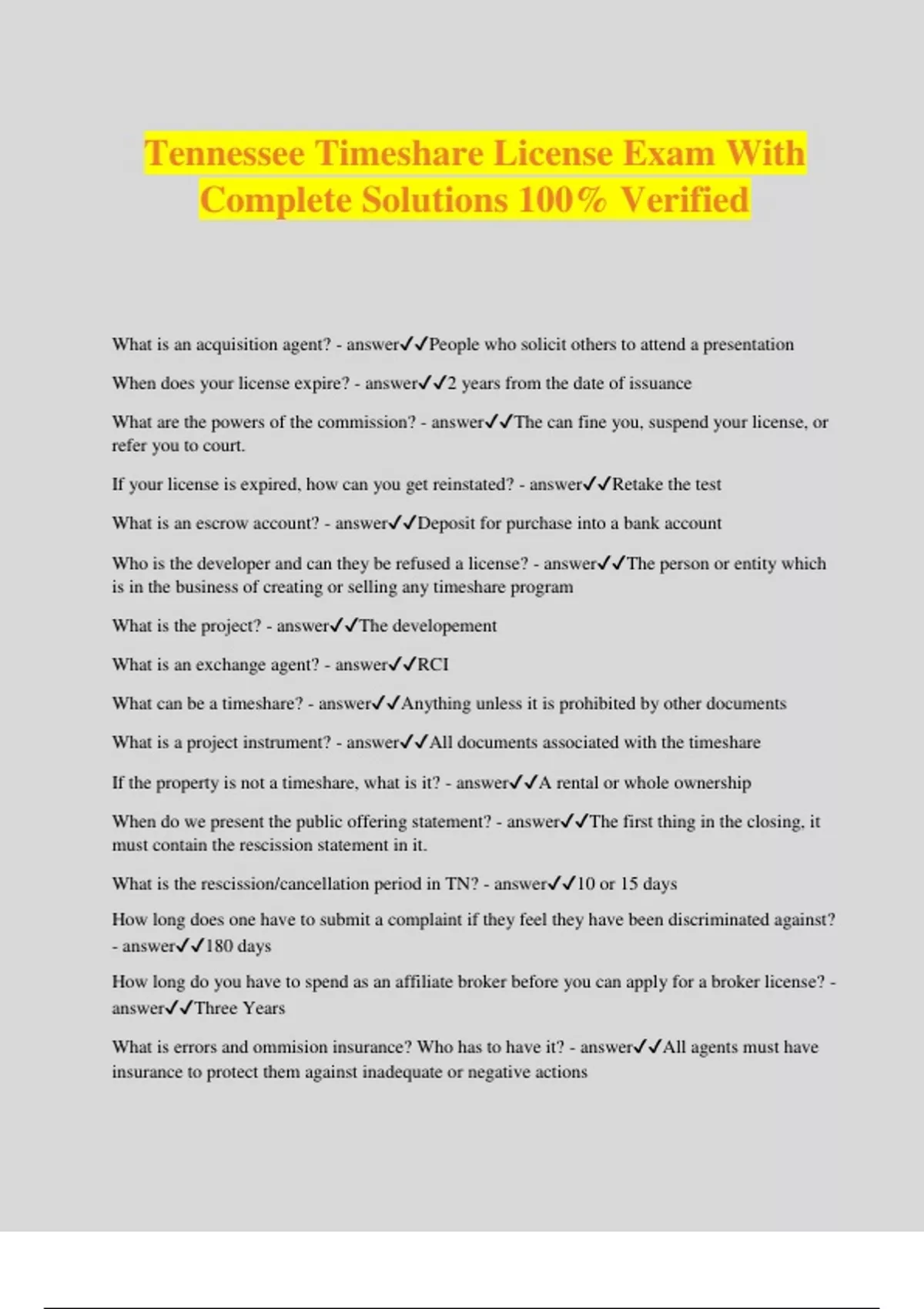 Tennessee Timeshare License Exam With Complete Solutions 100% Verified