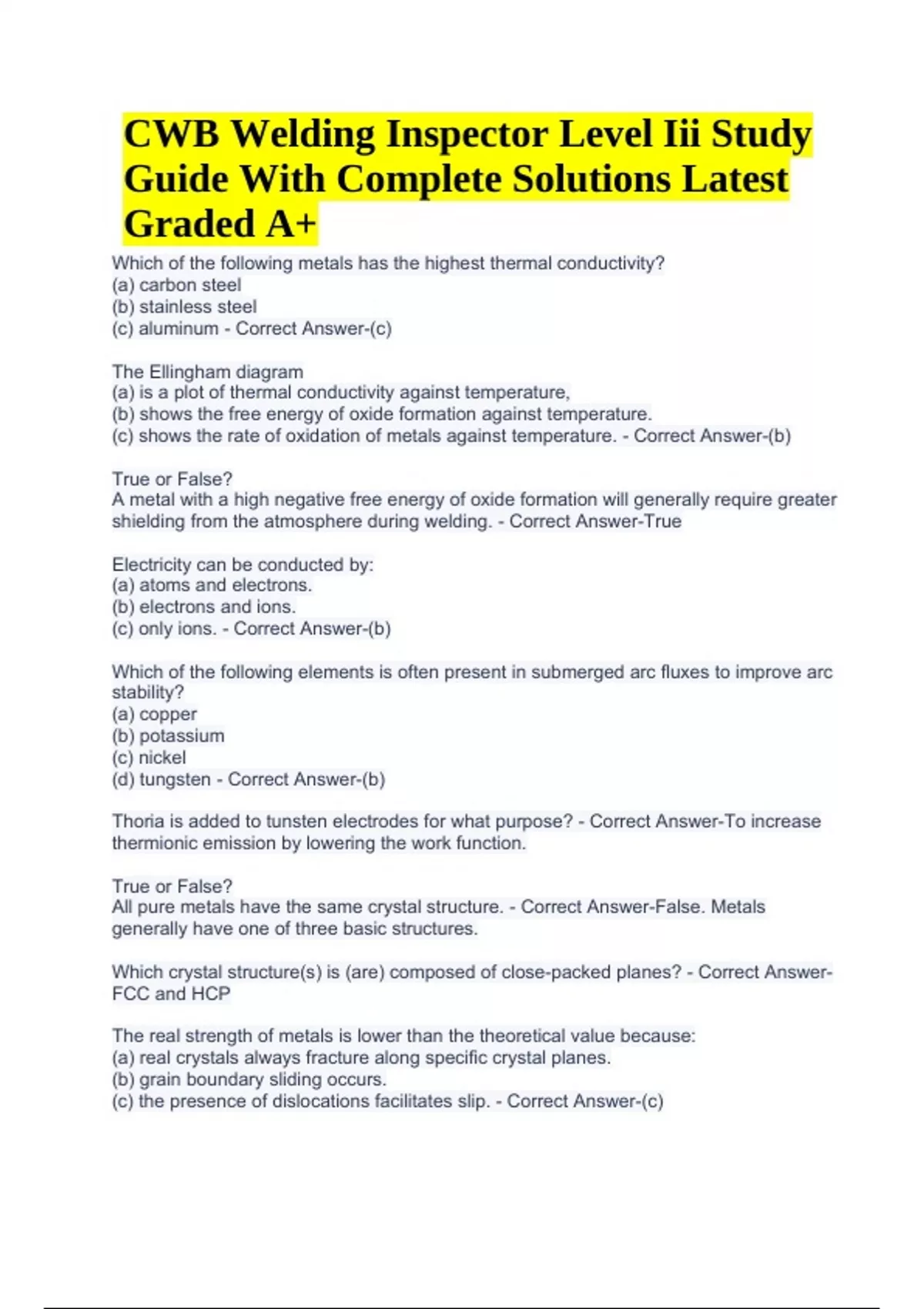 CWB Module 1 Questions With 100% Correct Answers Latest Update | CWB Welding Inspector Questions With 100% Correct Answers | CWB Level 2 Welding Inspection Exam With 100% Correct Answers Latest Update & CWB Welding Inspector Level 2 Study Guide With Complete Solutions Latest Graded A+ ()