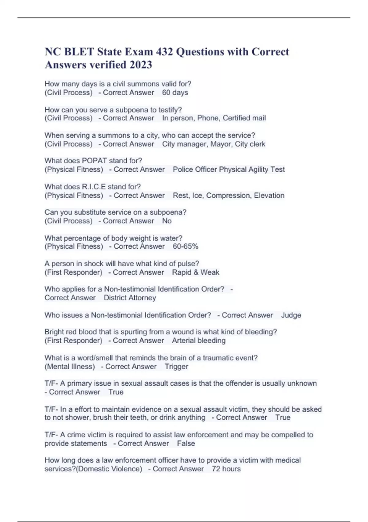 NC BLET HAZMAT LATEST QUESTIONS AND ANSWERS NC BLET 2021 Fingerprinting & Photographing Latest Exam With Verified Answers NC BLET State Exam Updated Questions And Answers (2024– 2025) With Complete Solution NC BLET STATE EXAM OBJECTIVES, Questions and Answers, 100% Accurate, Rat A+2023 NC BLET State Exam 432 Questions with Correct Answers verif