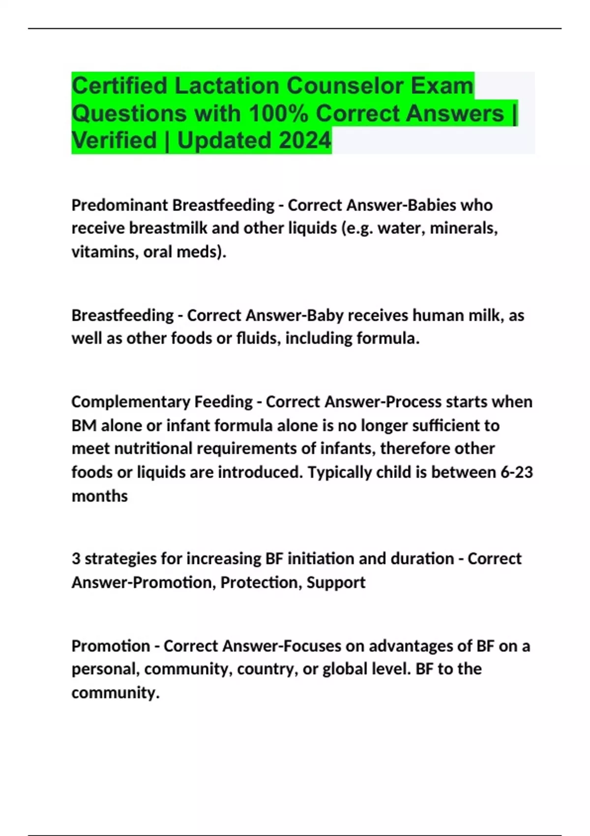 Certified Lactation Counselor (CLC) Study Exam with Complete questions and Answers Graded A+ CLC Practice Exam Questions with 100% Correct Answers | Verified | Updated 2024 PCE Certified Breastfeeding Counselor Exam With 100% Correct Answers 2024 CLC Exam Questions With 100% Correct Answers 2024 Certified Breastfeeding Counselor CBC Exam Questions
