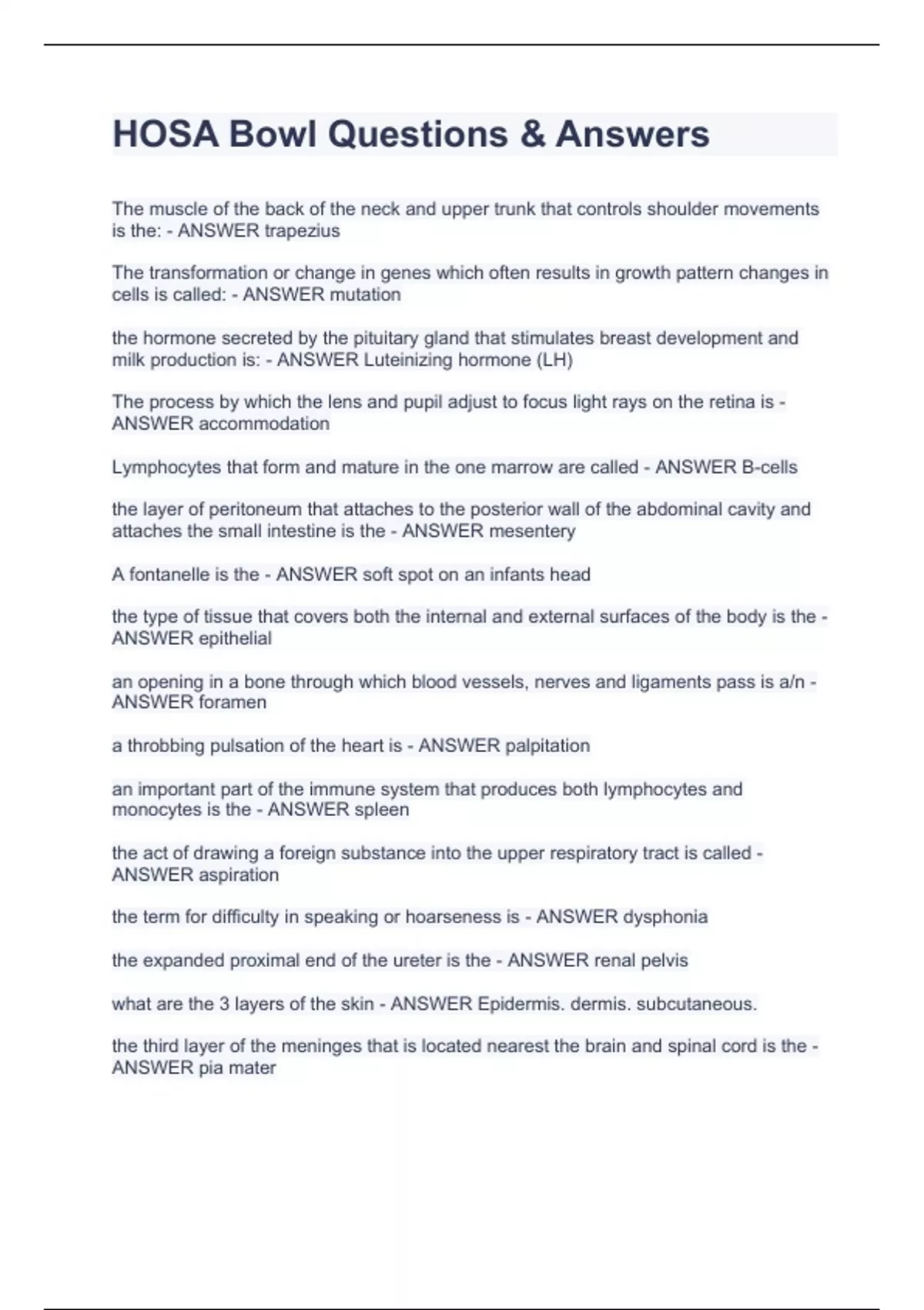 HOSA Bowl Completely Solved(RATED A+)Correct 100%(COMPLETE FULL PACK SOLUTIONS)EXAM BUNDLE