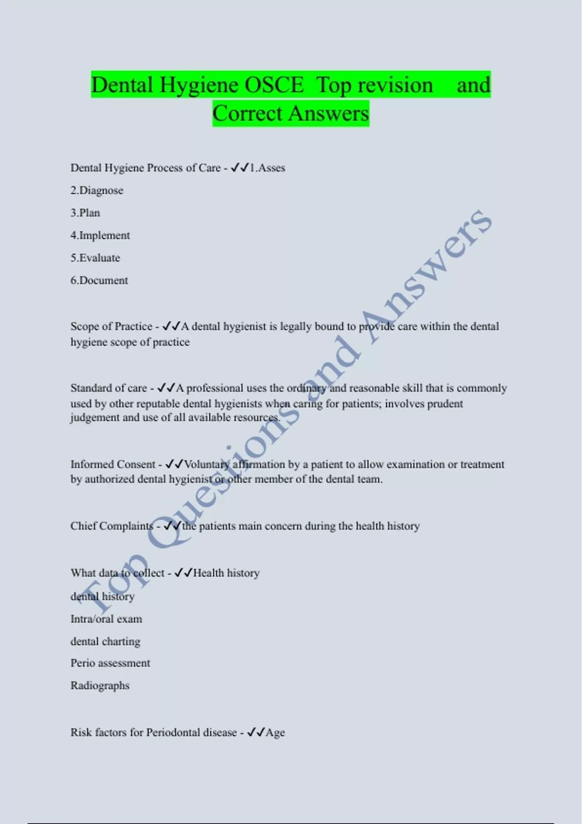 OSCE Dental Hygiene Top Selected tested Questions and CORRECT ANSWERS Package deal