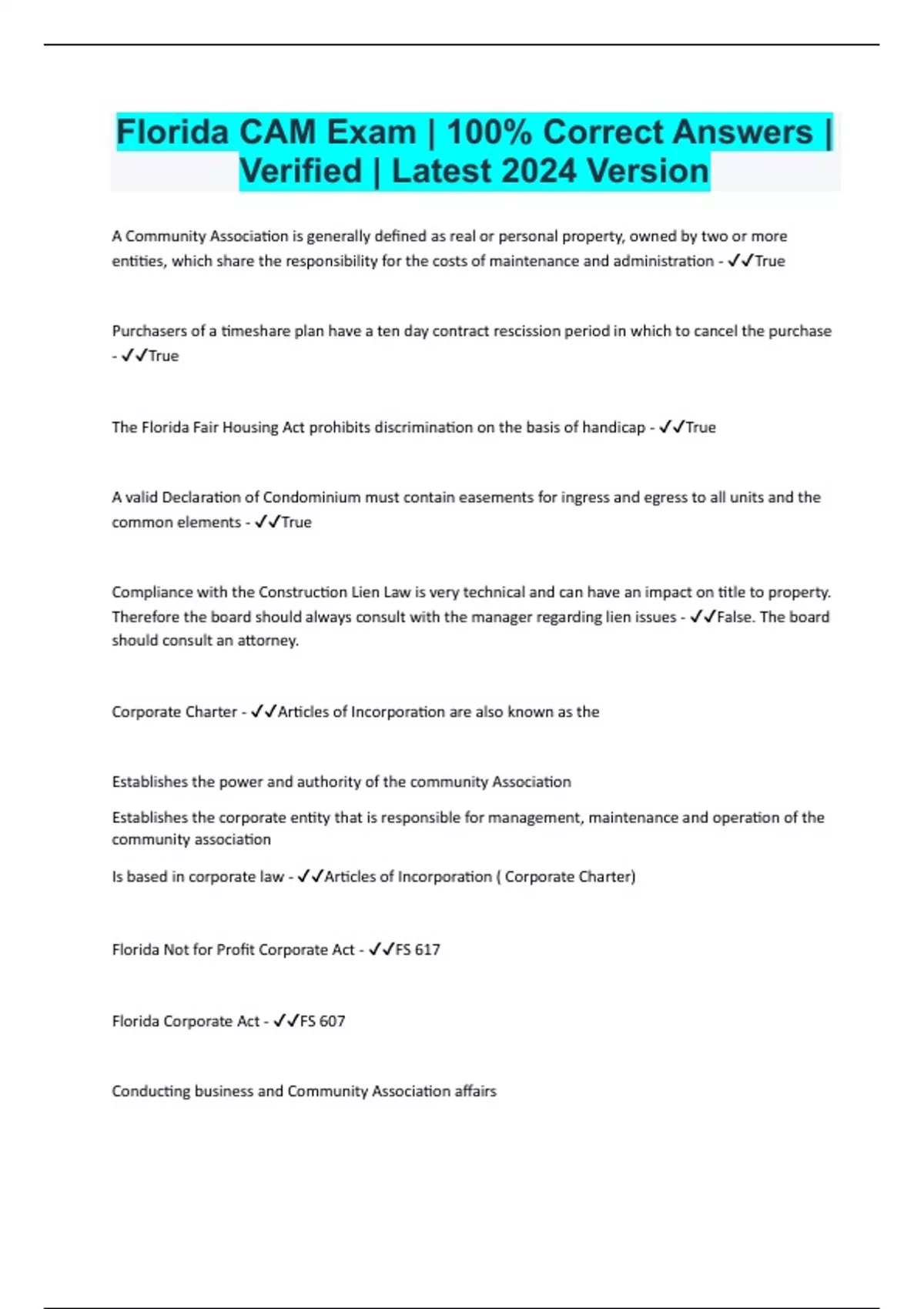 Florida CAM License Q&A | 100% Correct Answers | Verified | Latest 2024 Version
