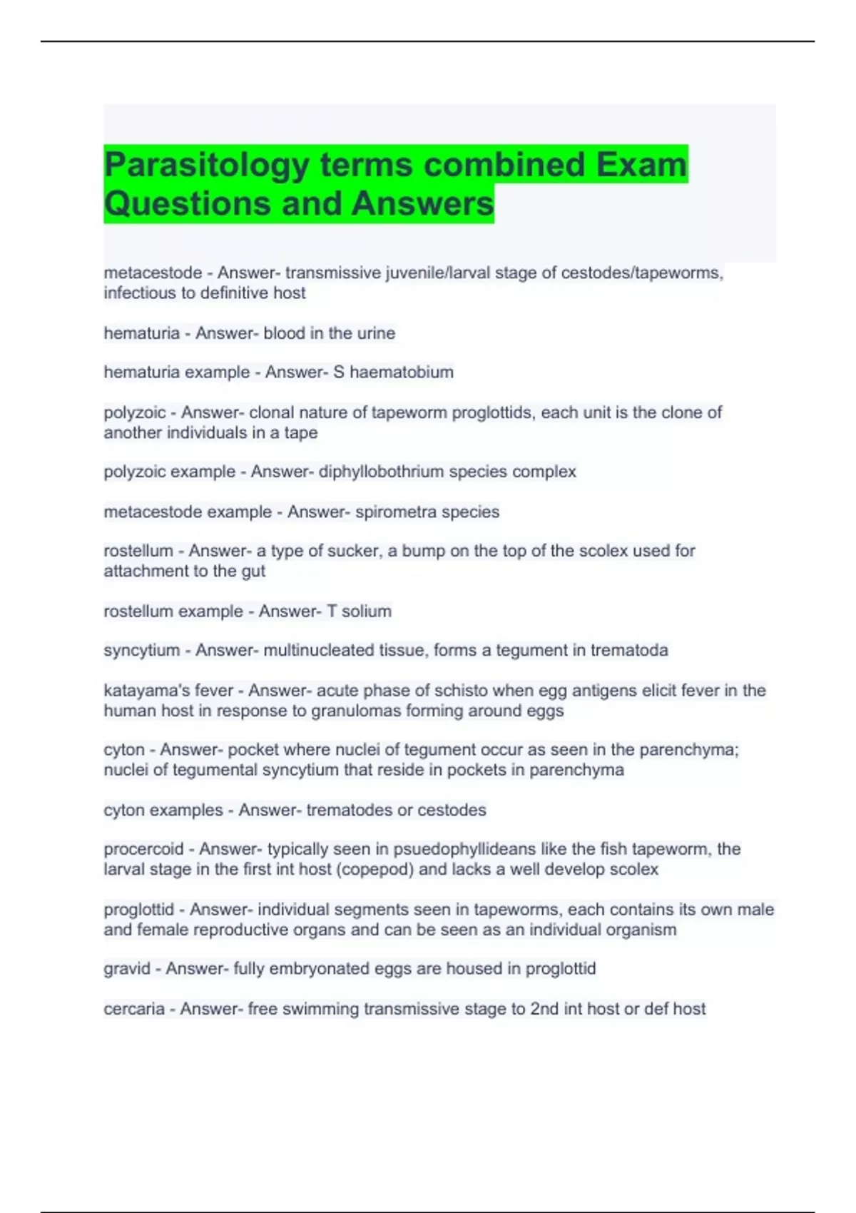 1 Exam (elaborations) Parasitology terms combined Exam Questions and Answers 2 Exam (elaborations) Parasitology Review Questions and Answers 3 Exam (elaborations) Parasitology Review (Quiz Questions) with Verified Answers 4 Exam (elaborations) Parasitology Quiz -solved 5 Exam (elaborations) Parasitology Final Exam Review Questions and Answers