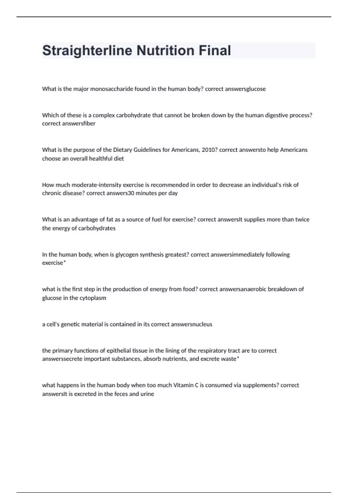 Nutrition 101 StraighterLine exam 2024 with 100% complete solutions Straighterline Nutrition Final exam 2024 with 100% correct answers