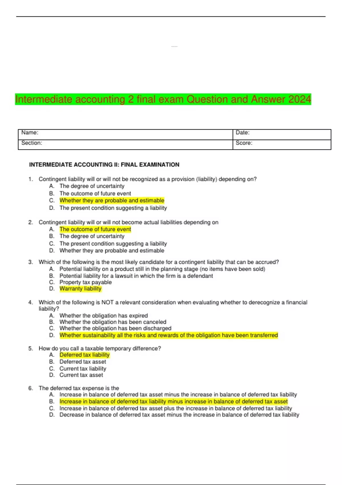 INTERMEDIATE ACCOUNTING EXAM Question and Answers latest updates 2024
