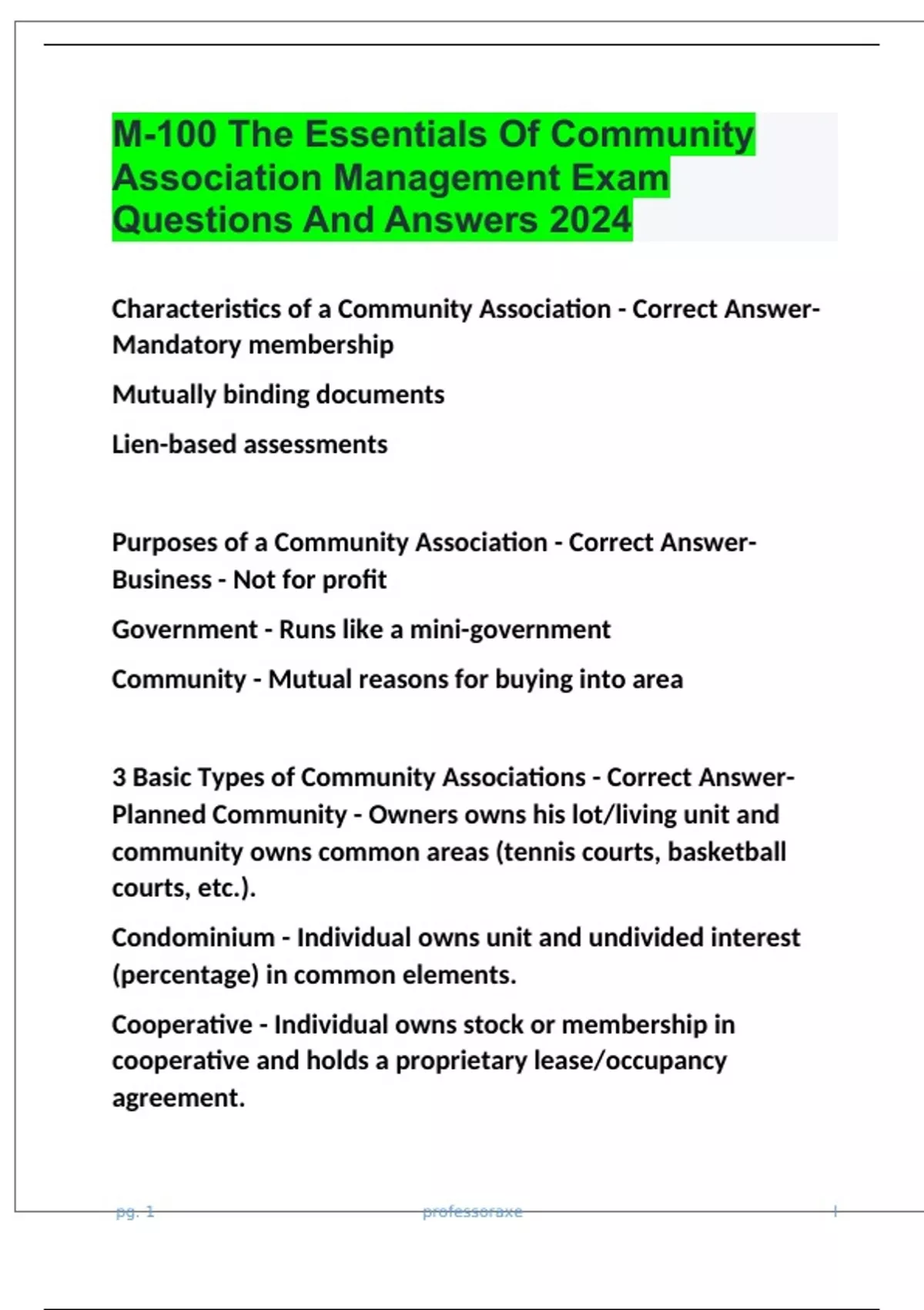 CMCA M100 Exam Questions With 100% Correct Answers 2024 M-100 Focus: Legal Basis Exam Complete Questions and Answers 100% Verified | 2024 M-100 - CH 1 Exam Questions With 100% Correct Answers 2024 M100 Exam Questions with 100% Correct Answers | Verified | Updated 2024 M-100 The Essentials Of Community Association Management Questions And Answers