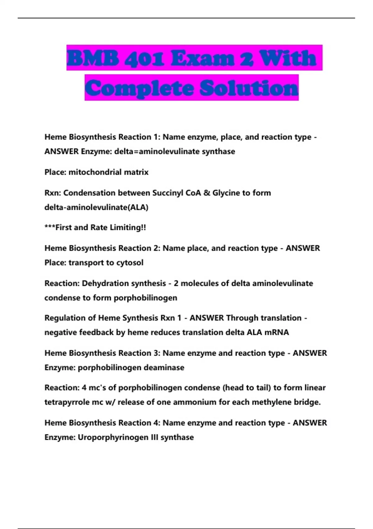 BMB401 - Biochemistry Exam 2 With Complete Solution