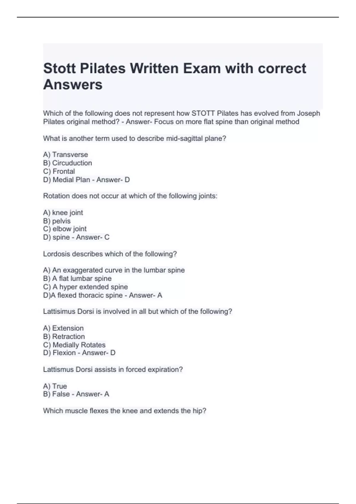 1 Exam (elaborations) Stott Pilates Written Exam with correct Answers 2 Exam (elaborations) Stott Pilates Preparation Exam Questions and Answers 3 Exam (elaborations) STOTT Pilates- Postural alignment Exam with 100% correct Answers 4 Exam (elaborations) STOTT Pilates Matwork Exam- Muscle Balance Questions and Answers 5 Exam (elaborations) Stott