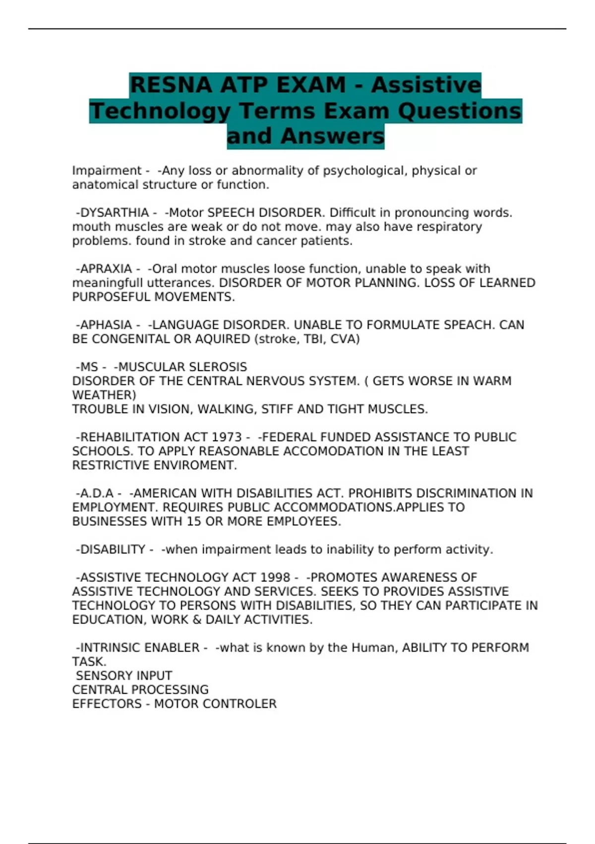 RESNA ATP EXAMS - QUESTIONS AND ANSWERS - BUNDLE