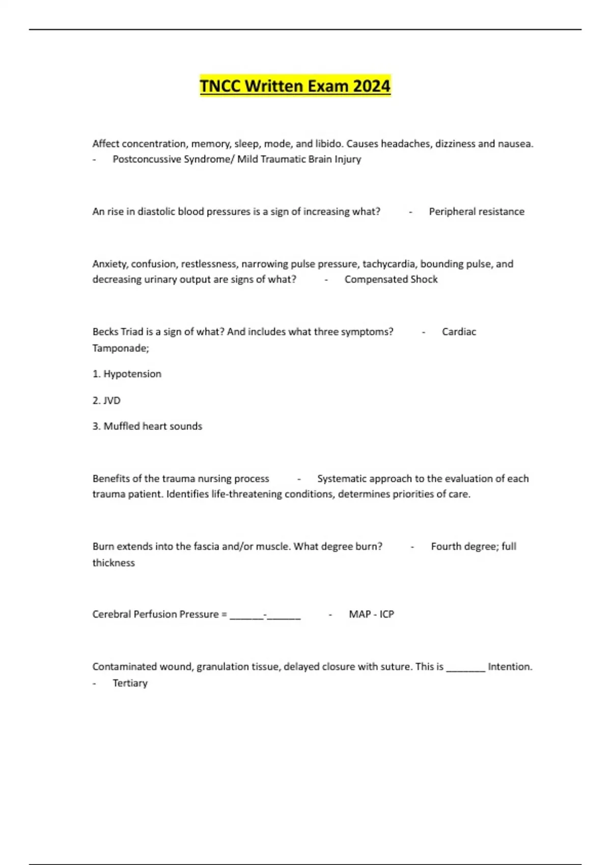 TNCC Notes for Written Exam, TNCC Prep, TNCC test prep A 415 Questions with 100% Correct Answers ; TNCC Final Exam Test 2023/24 Answered Correctly Graded A+ ; TNCC Written Exam 2024 With Correct Answers |100% Verified| ; What is tension? Answer is: stretching force by pulling at opposite ends What is compression? Answer is: Crushing by