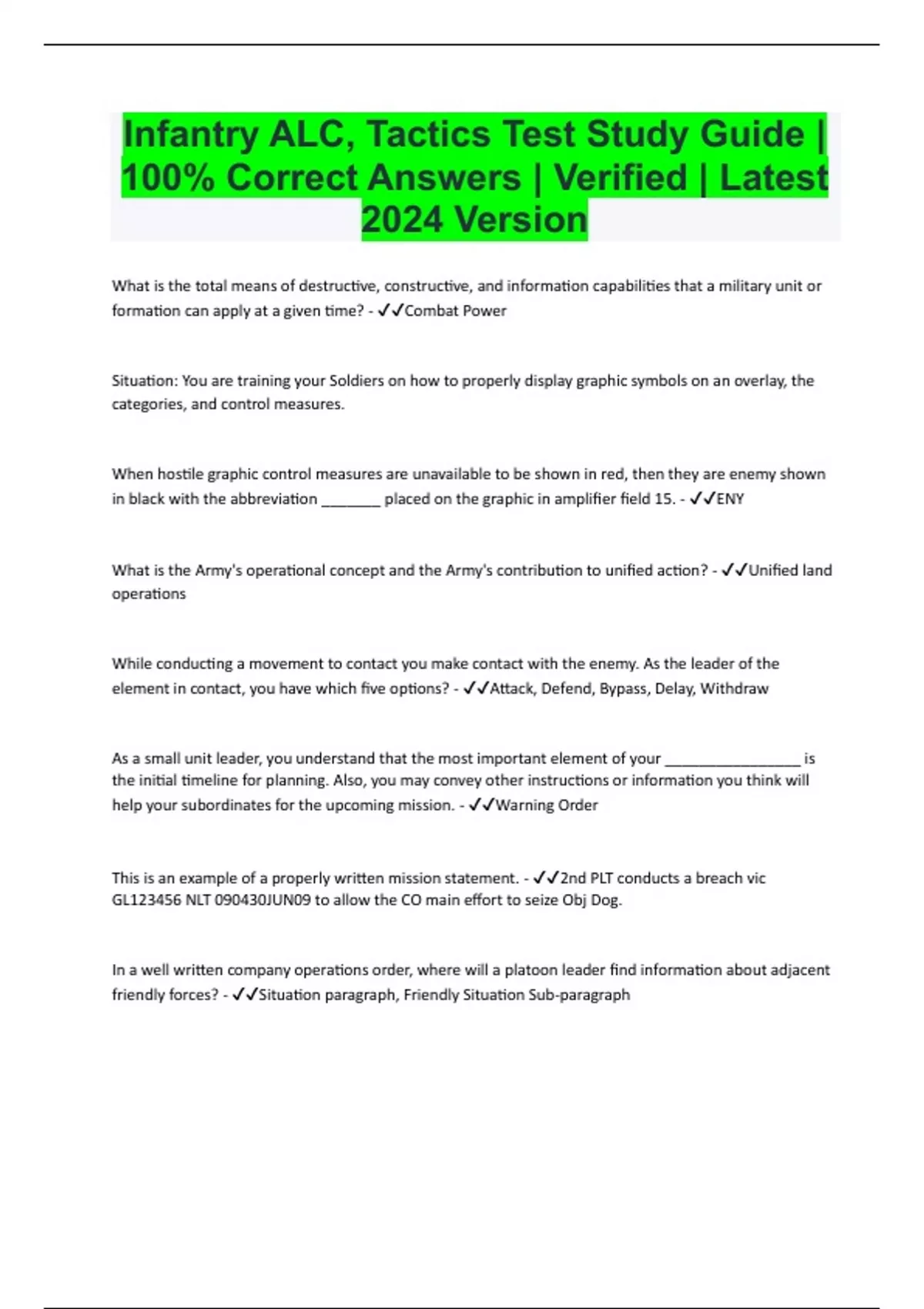 Infantry ALC, Tactics Test Study Guide | 100% Correct Answers | Verified | Latest 2024 Version