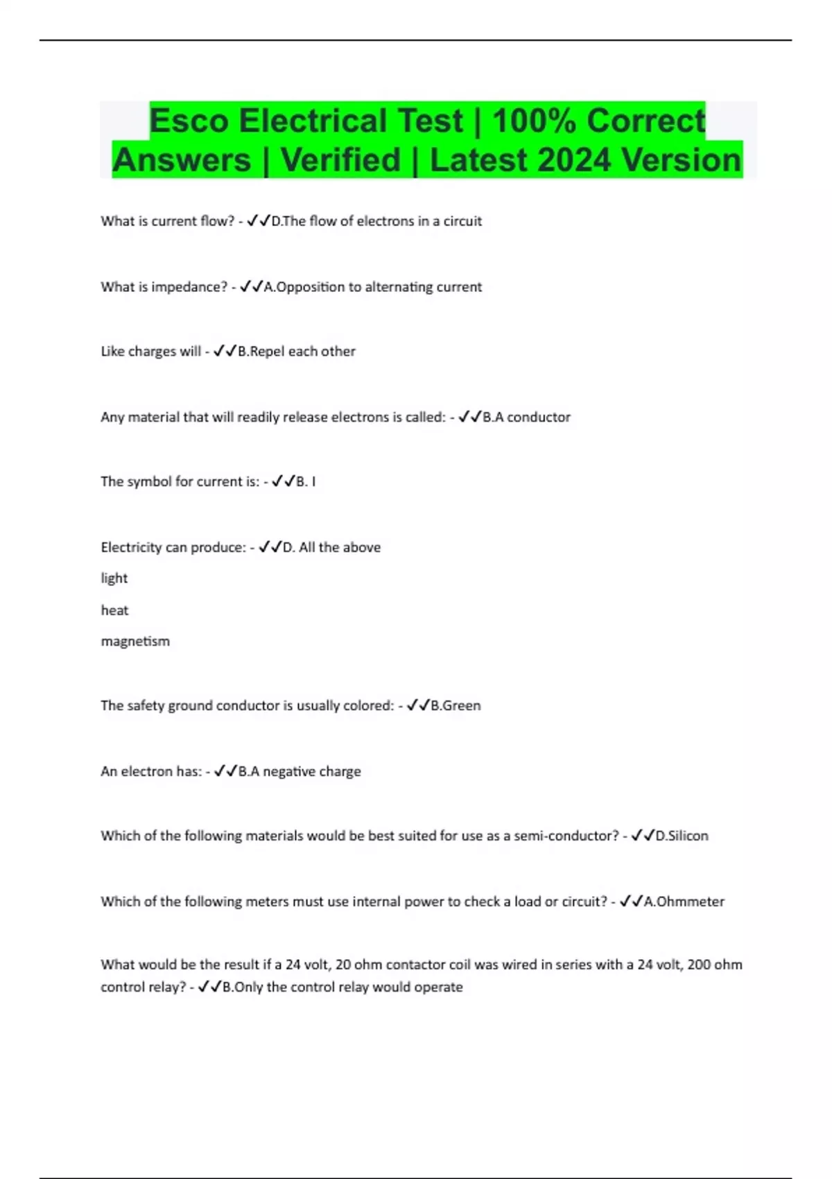 Esco Electrical Test | 100% Correct Answers | Verified | Latest 2024 Version