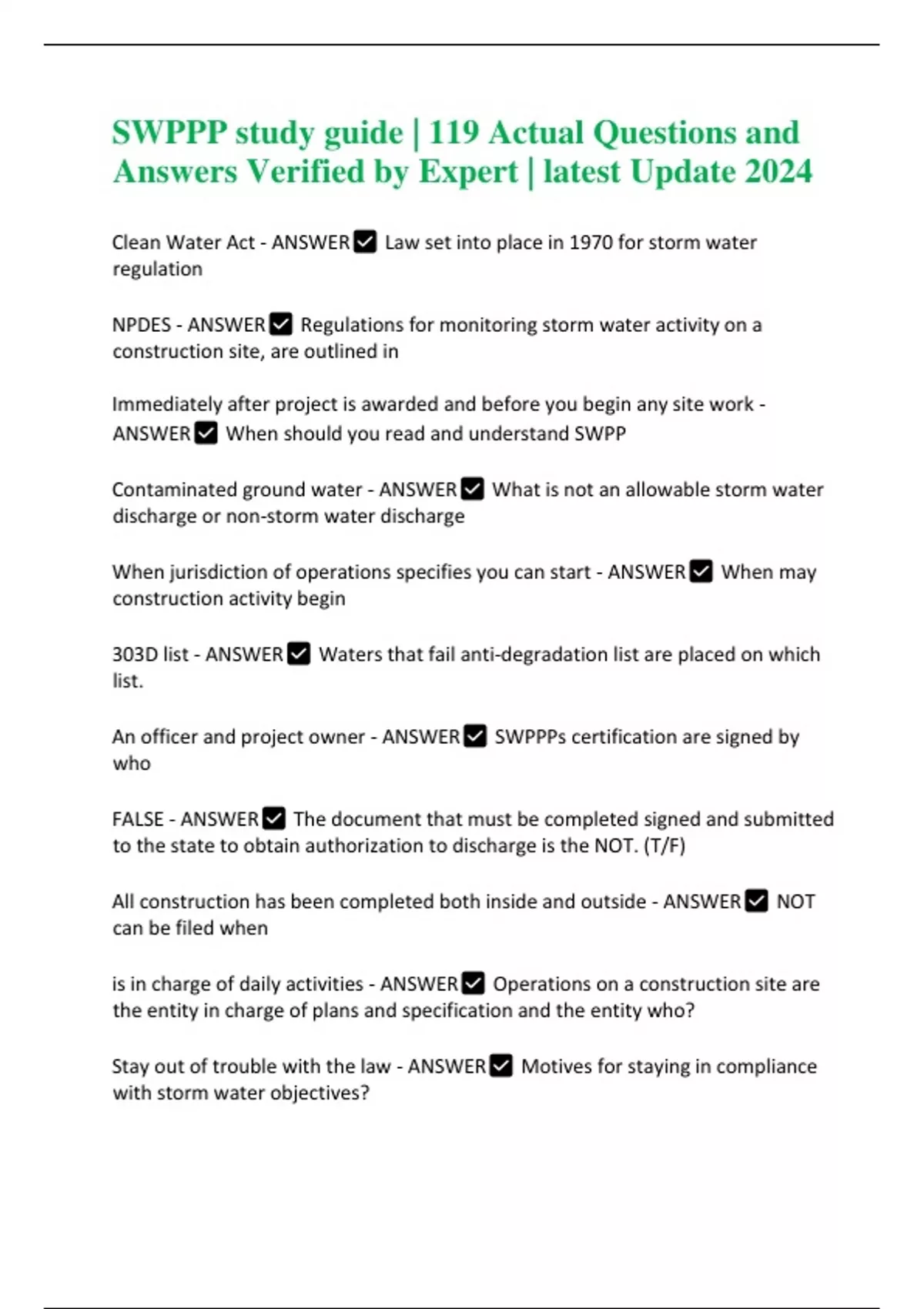 SWPPP study guide | 119 Actual Questions and Answers Verified by Expert | latest Update 2024