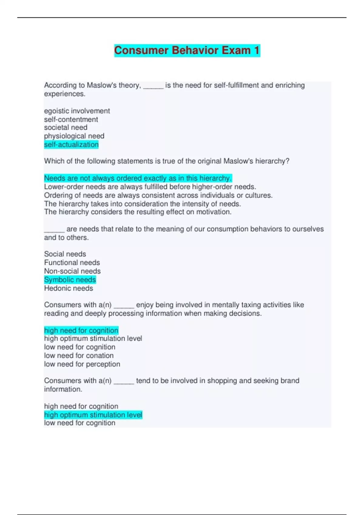 Consumer Behavior Final Exam - Questions with Verified Answers