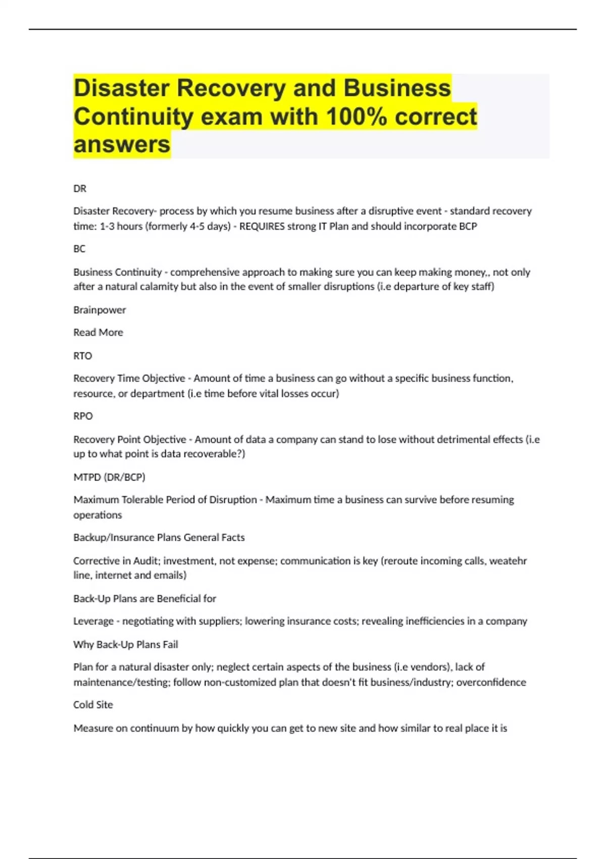 BUSINESS CONTINUITY AND DISASTER RECOVERY EXAMS COMPILATION BUNDLE|ALL GRADED A+|GUARANTEED SUCCESS