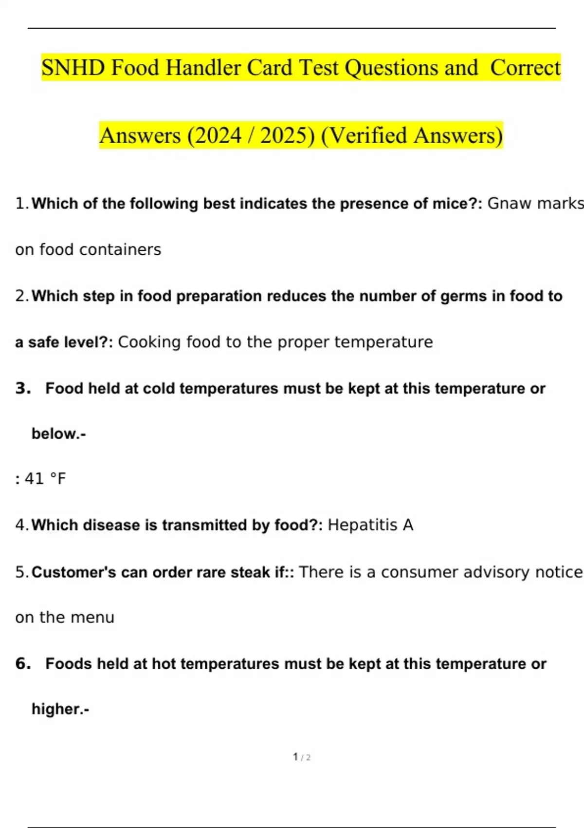 SNHD Food Handler Card Test Questions and Answers (2024 / 2025) (Verified Answers)