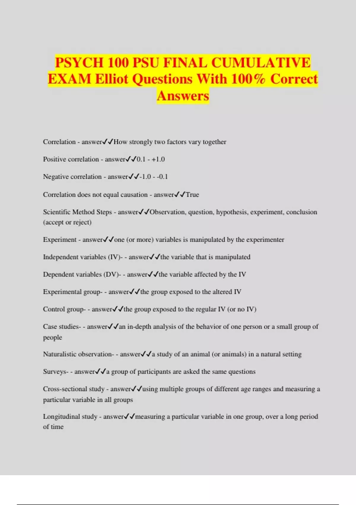 PSYCH 100 PSU FINAL CUMULATIVE EXAM Elliot Questions With 100% Correct Answers