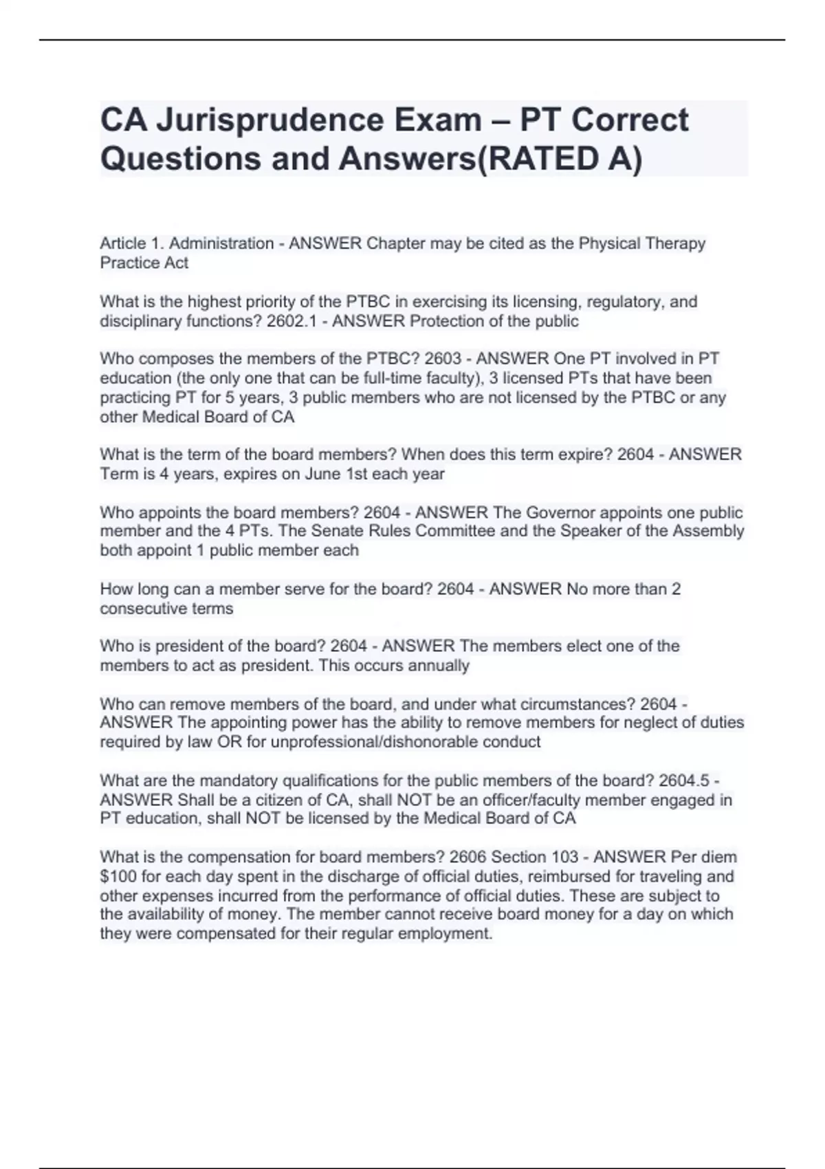 PT Jurisprudence Exam for California- study guide #1 Accurate 100%(RATED A+)