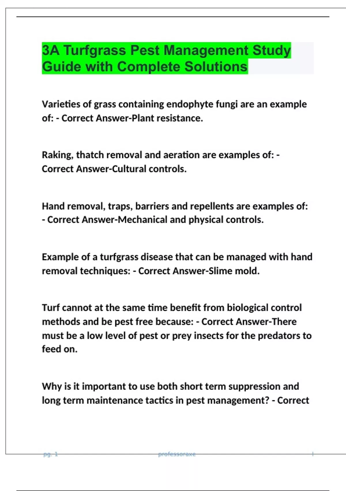 Turf Management Exam 1 Questions with 100% Correct Answers | Verified | Updated 2024 3A Turfgrass Pest Management Study Guide with Complete Solutions Turfgrass Pest Control Exam Questions With 100% Correct Answers 2024 Turf (3b): Turf Pest Management Exam With 100% Correct Answers 2024
