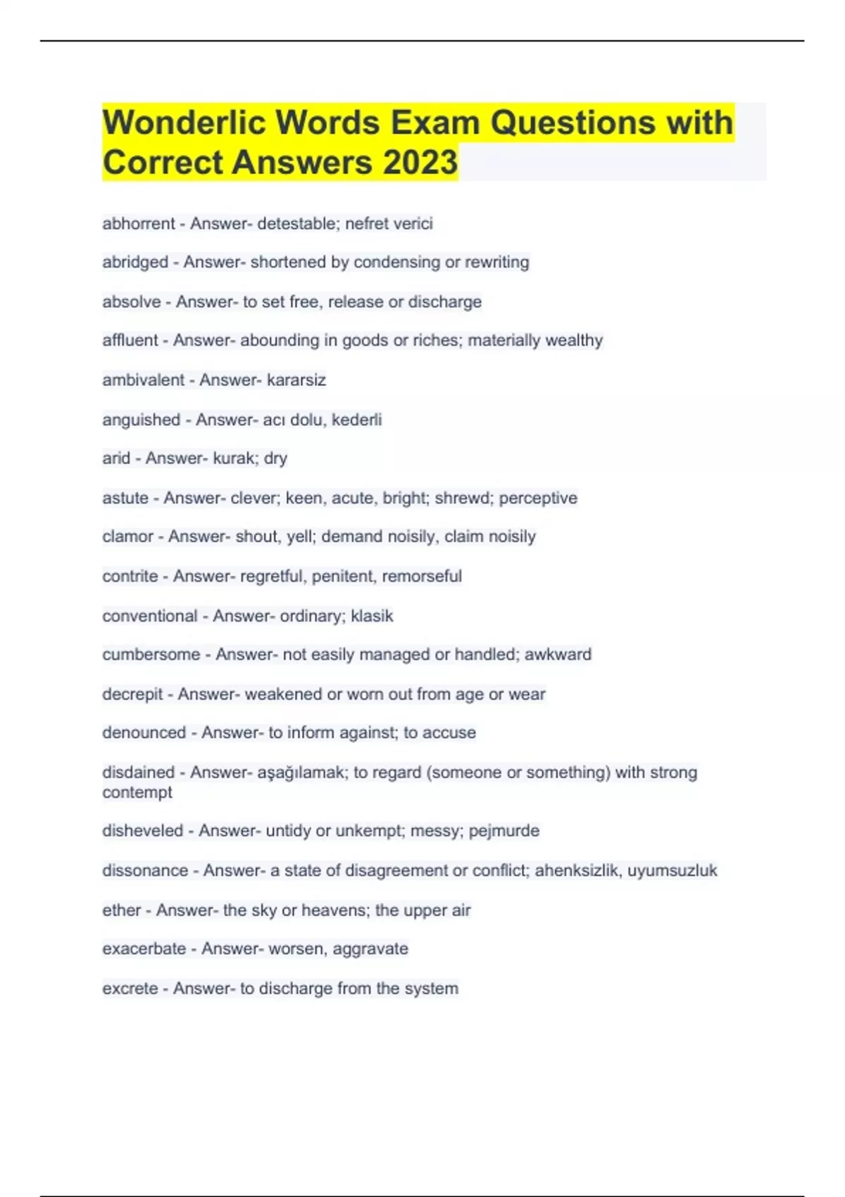 Exam (elaborations) Vocabulary Wonderlic Exam Questions and Answers Grated A+ Exam (elaborations) Wonderlic 50 Exam Questions with Correct Answers Exam (elaborations) Wonderlic Assessment Test with Verified Answers Exam (elaborations) Wonderlic Basic Skills Test Exam with Complete Solutions Exam (elaborations) Wonderlic Exam Questions with