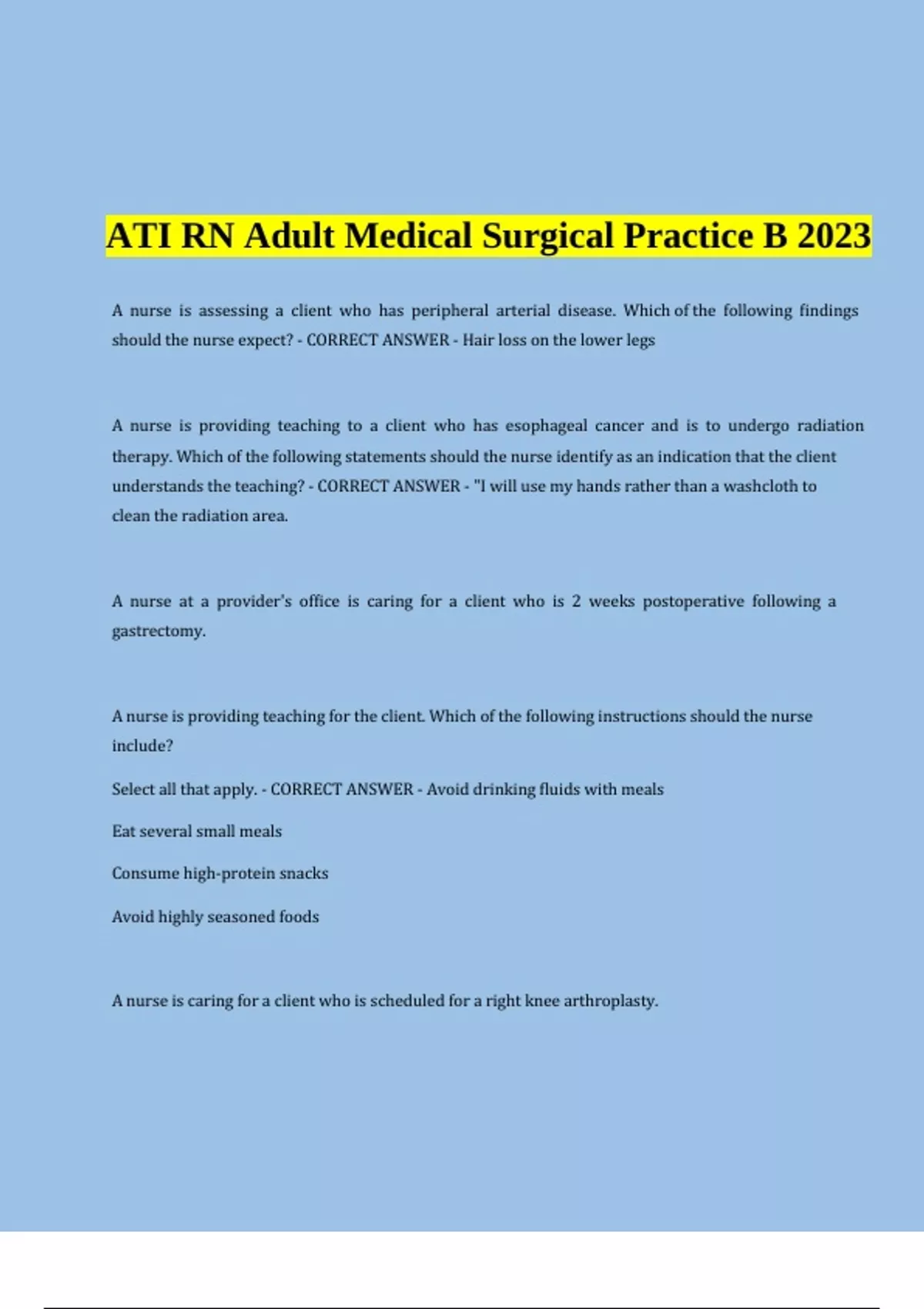 ATI RN ADULT MEDICAL SURGICAL PROCTORED EXAM 2024 UPDATED, ATI RN Adult Medical Surgical Online Practice 2019 B 100%Correct Answers & ATI RN Adult Medical Surgical Practice B 2023.