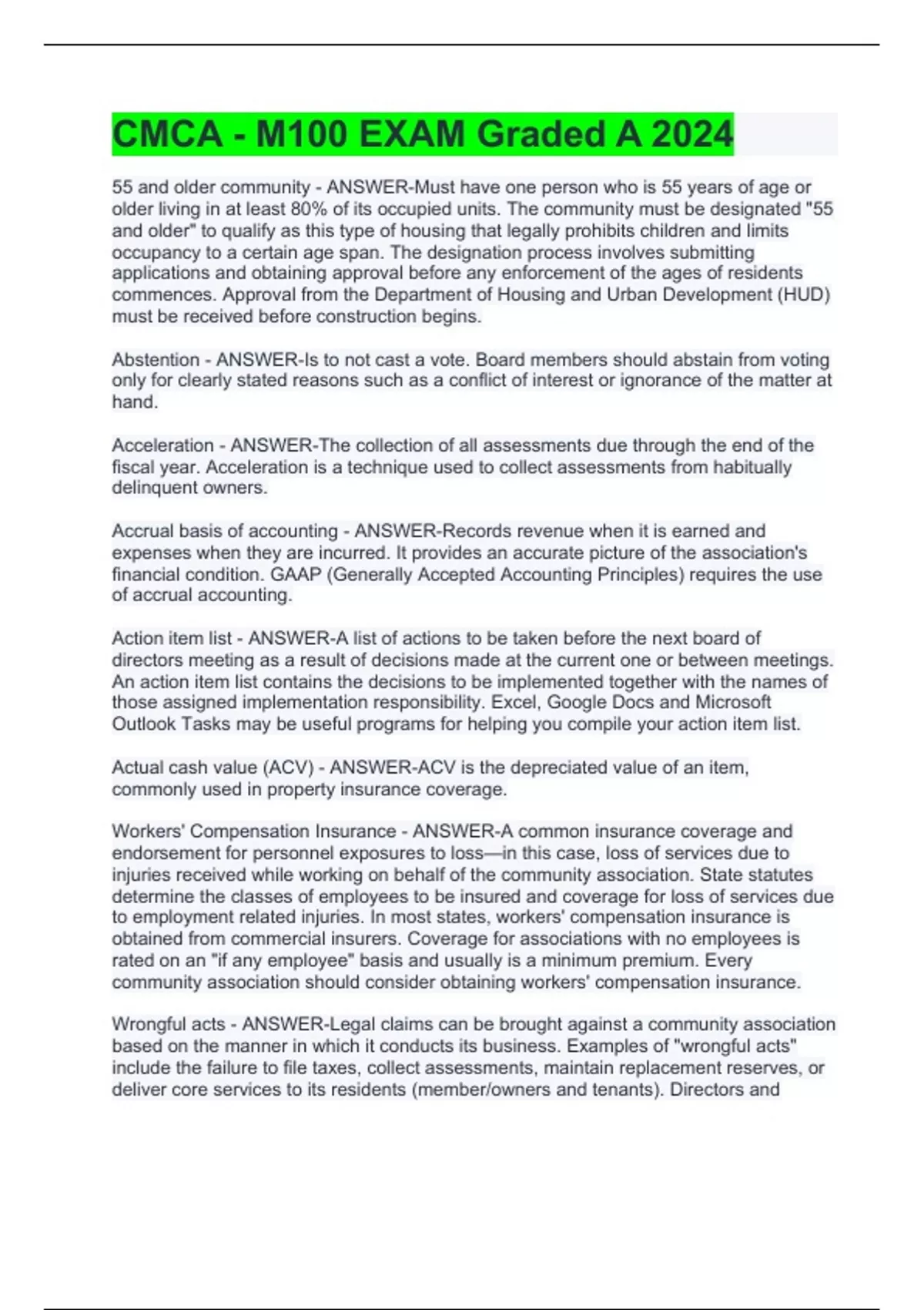 1 Exam (elaborations) CMCA - M100 EXAM Graded A 2024 2 Exam (elaborations) CMCA M100 Continuous Assessment Test Solved 100% Correct 3 Exam (elaborations) M-100 The Essentials of Community Association Management Test 2024 4 Exam (elaborations) M100 Solved 100% Correct 2024 5 Exam (elaborations) M-100 The Essentials of community association manag