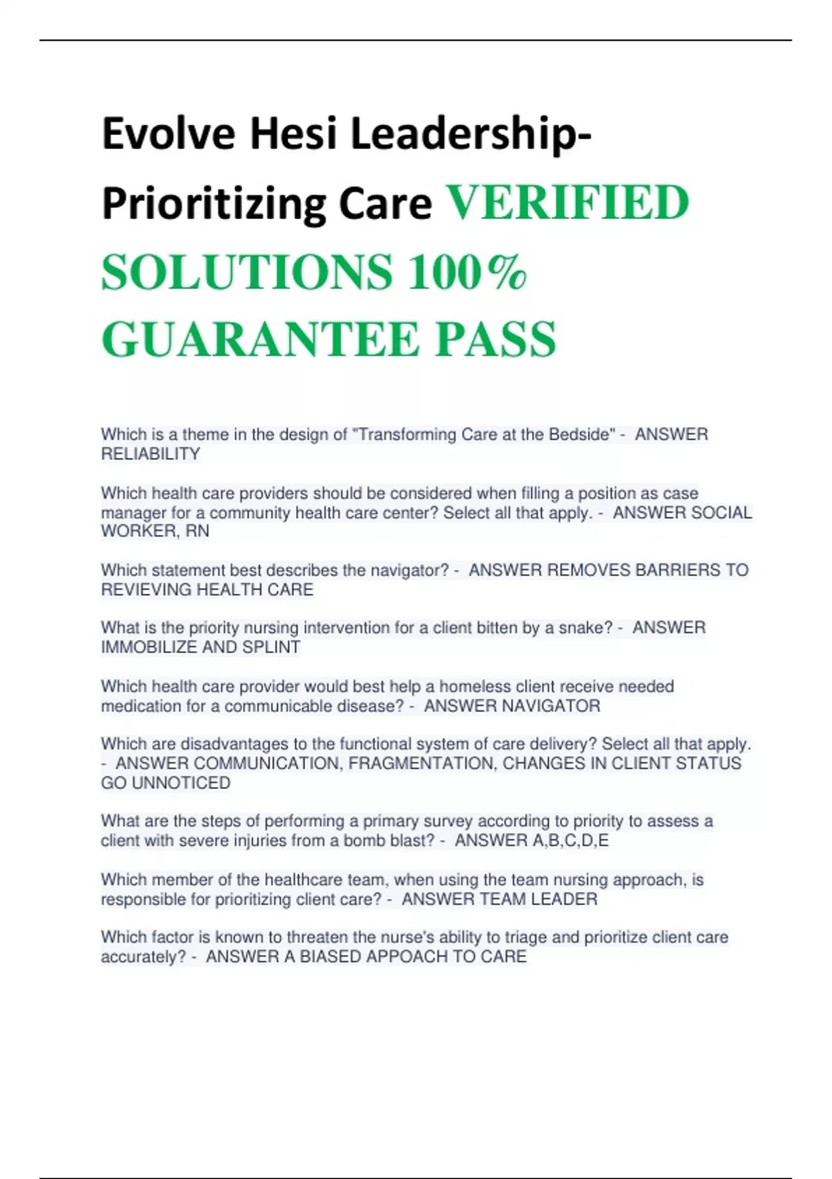 BUNDLE FOR Evolve Hesi LeadershipPrioritizing Care VERIFIED SOLUTIONS 100% GUARANTEE PASS