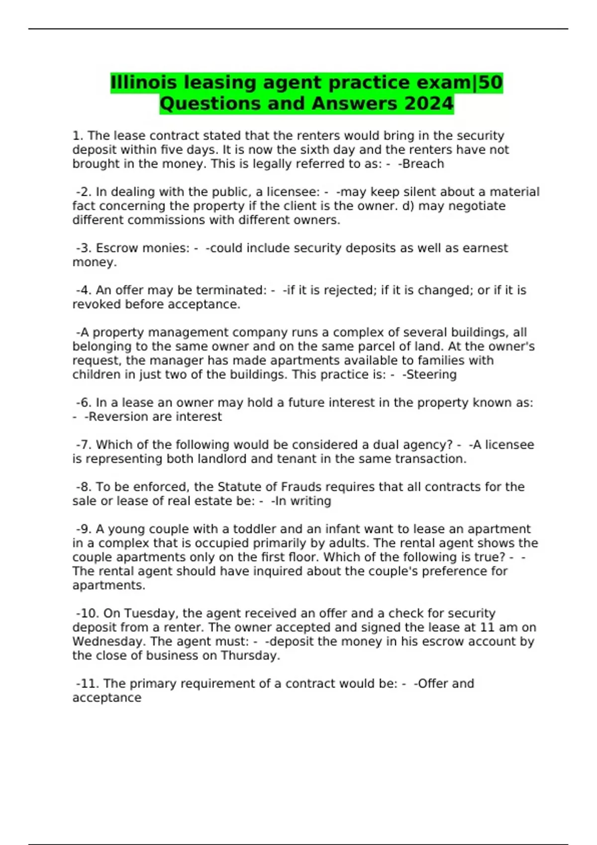 Illinois leasing agent practice exam|50 Questions and Answers 2024