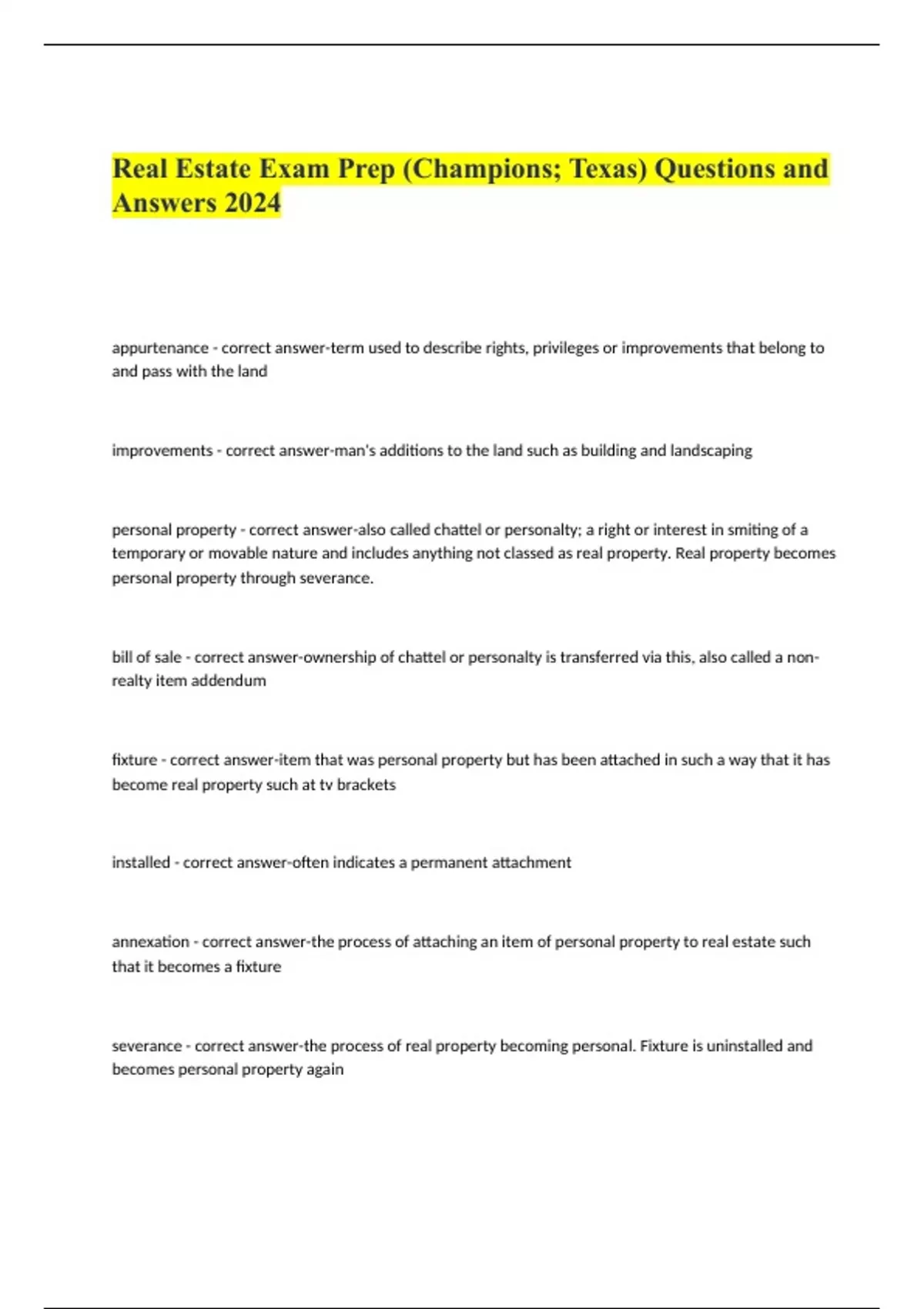 Real Estate Exam Prep (Champions; Texas) Questions and Answers 2024 Champions real estate finance Exam Questions with Verified Answers Real estate Investments / champions Exam Questions with correct Answers Champions Real Estate Finance Exam with complete solutions Champions Real Estate Finance Exam Questions and Answers 2024 Principles of Real Est