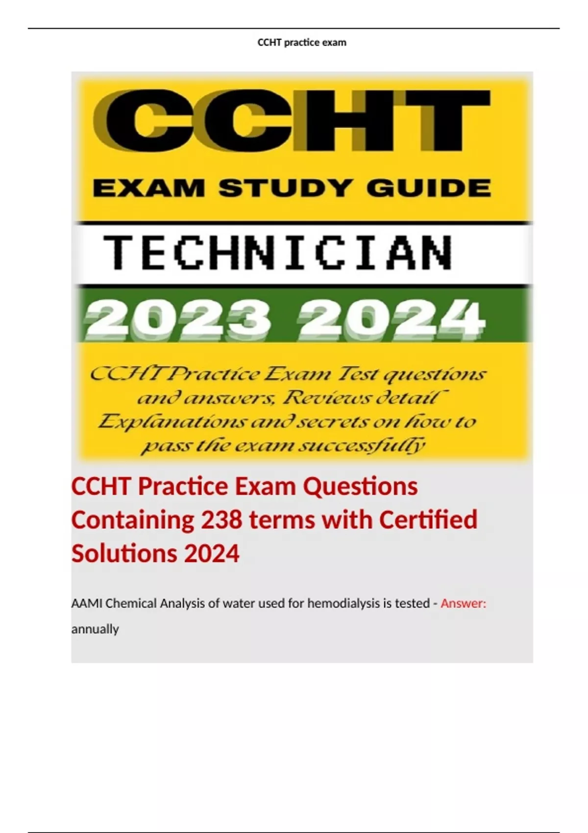 1 Exam (elaborations) Fresenius ~ CCHT Certification Preparation Test Questions and Answers/ A+ Score Solution 2024. 2 Exam (elaborations) CCHT Study Guide Exam Questions (323 Terms) with Expert Verified solutions 2024. 3 Exam (elaborations) CCHT Practice Test Questions Containing 132 terms with Certified Solutions Updated 2024. 4 Exam (elaborat