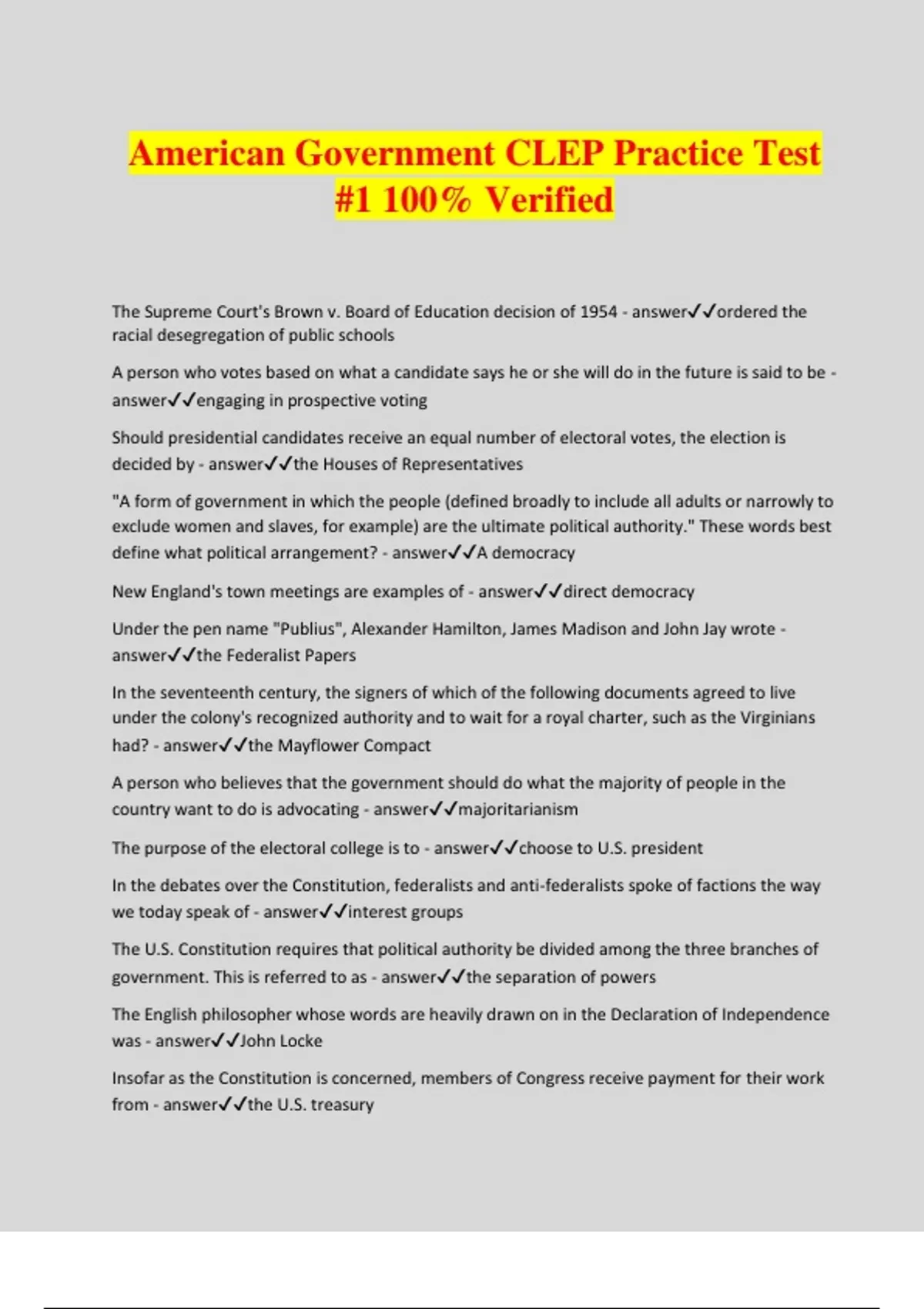 CLEP AMERICAN GOVERNMENT PRACTICE TEST WITH COMPLETE SOLUTIONS