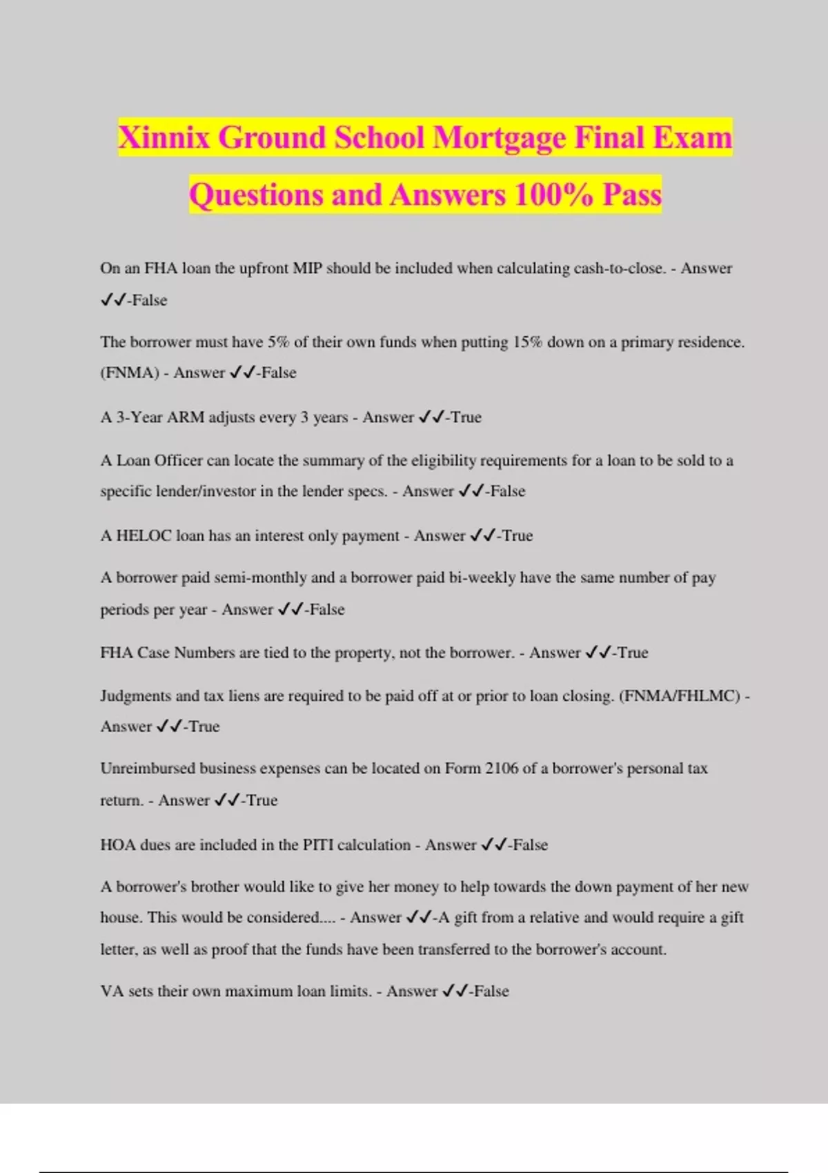 Xinnix Ground School Mortgage Final Exam Questions and Answers 100% Pass