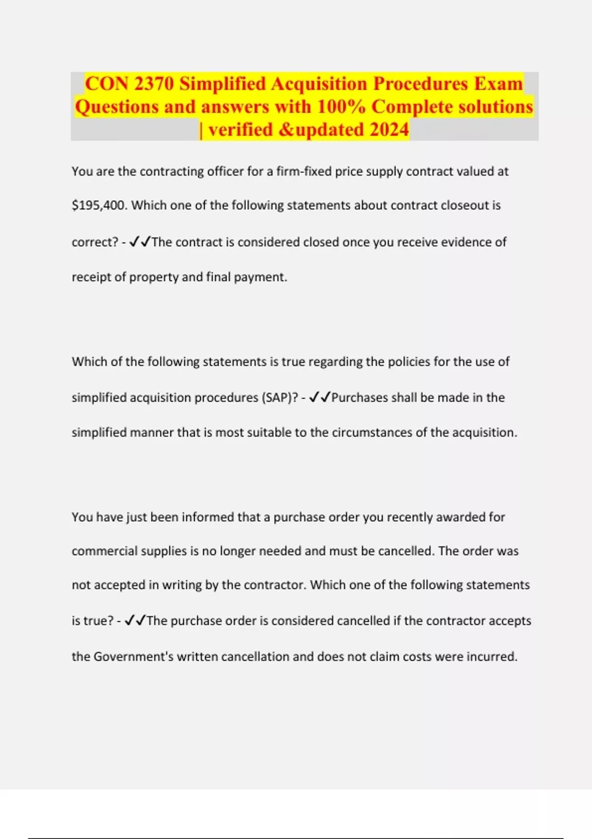 CON 2370 Simplified Acquisition Procedures Exam Questions and answers with 100% Complete solutions | verified &updated 2024