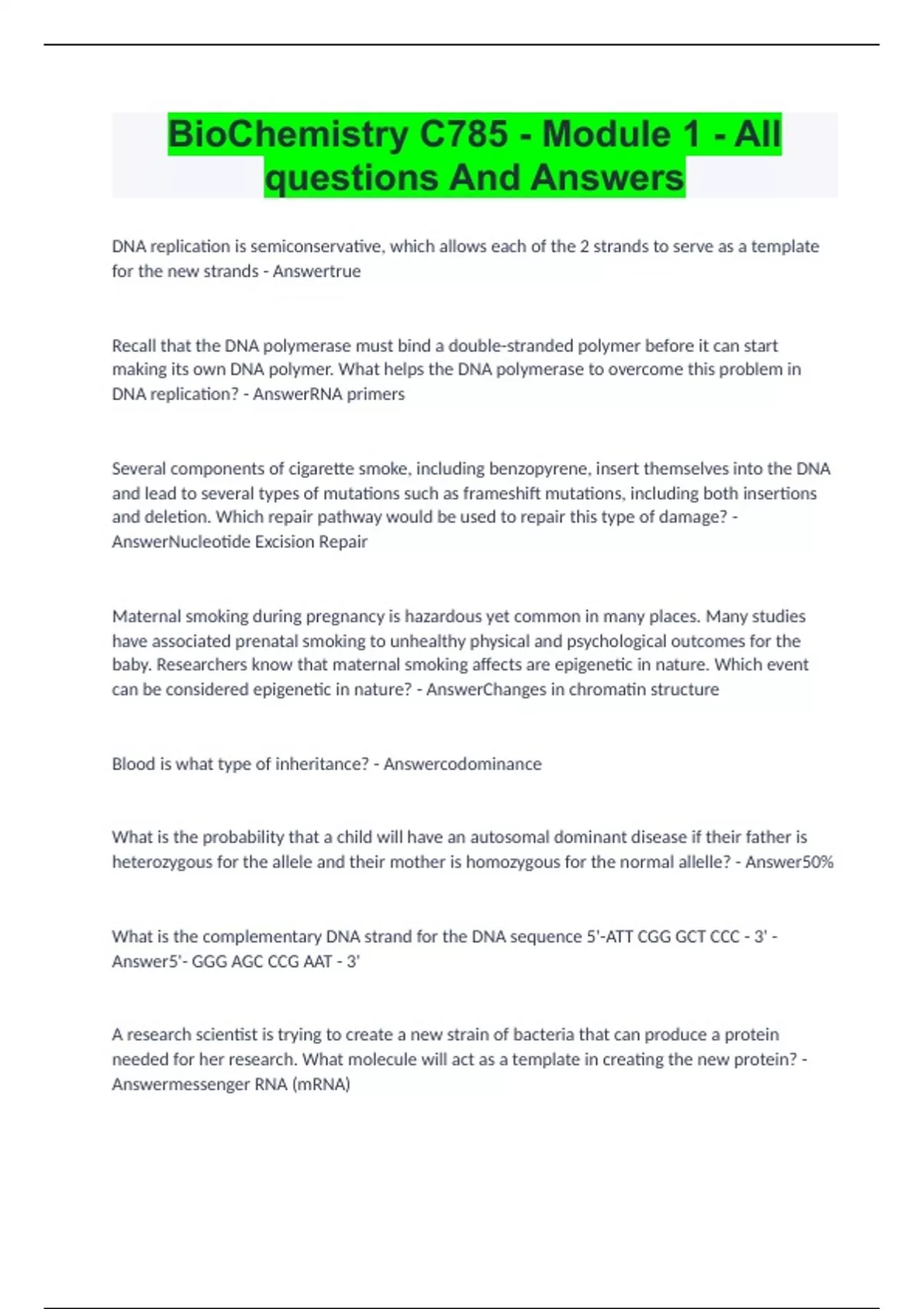 Exam (elaborations) WGU Biochemistry C785: Unit 4 DNA and RNA Final Exam Question and Answers WGU BioChem OA Review C785 Biochemistry pre-assessment WGU C785 Module 2 C785 Biochemistry Bio Chem C785 - WGU - Module 4 -