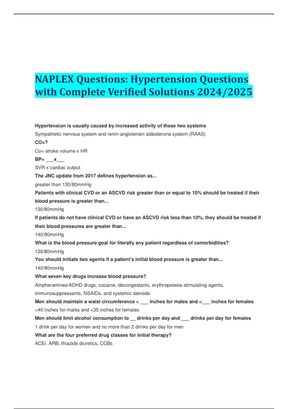 NAPLEX Questions: Hypertension Questions with Complete Verified Solutions 2024/2025
