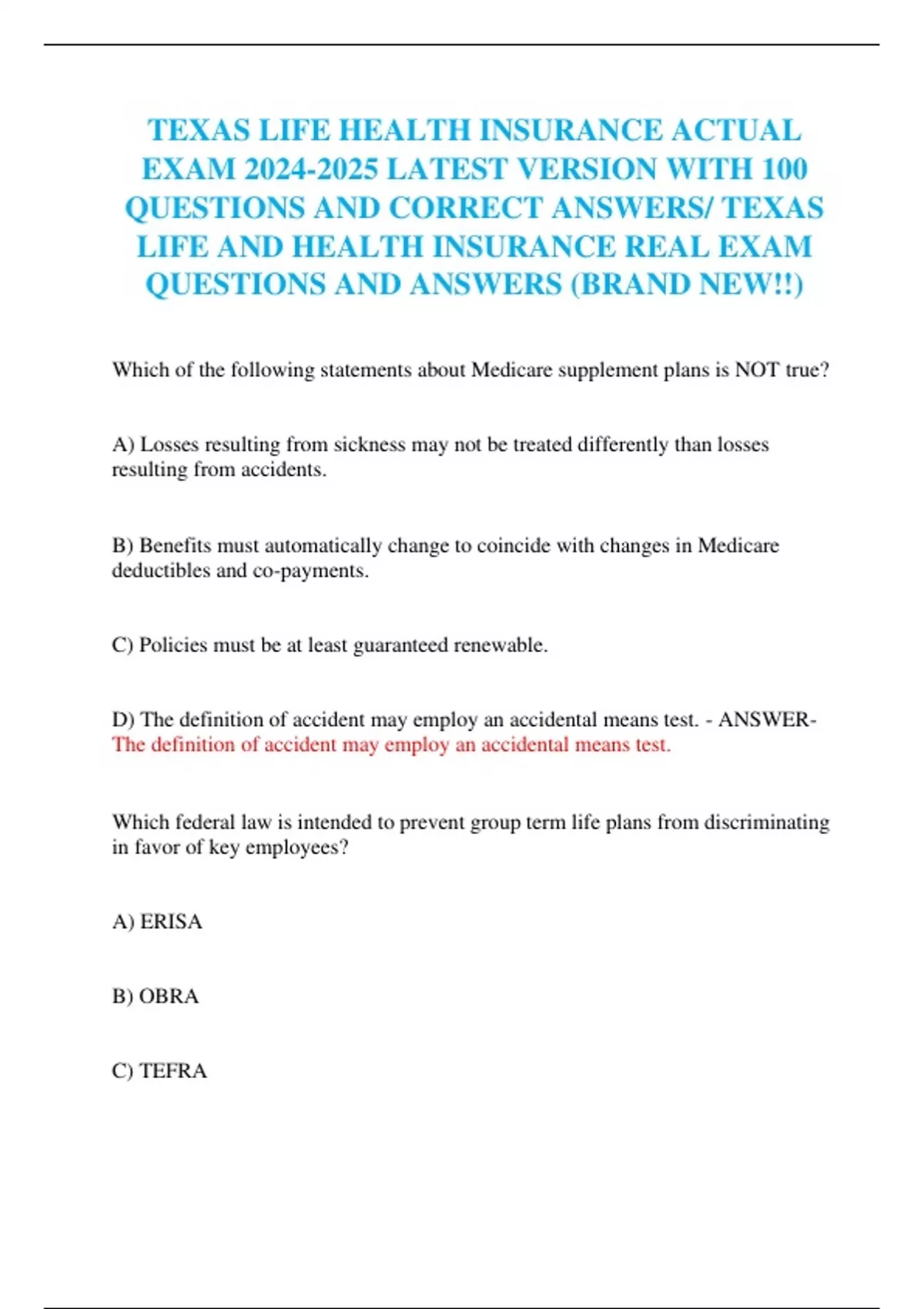 TEXAS LIFE HEALTH INSURANCE EXAMS BUNDLE 2024/2025 LATEST VERSIONS WITH 800+ QUESTIONS AND CORRECT ANSWERS / TEXAS LIFE AND HEALTH INSURANCE EXAM (LIFE AGENT LICENSE EXAM) REAL EXAM QUESTIONS (BRAND NEW!!)