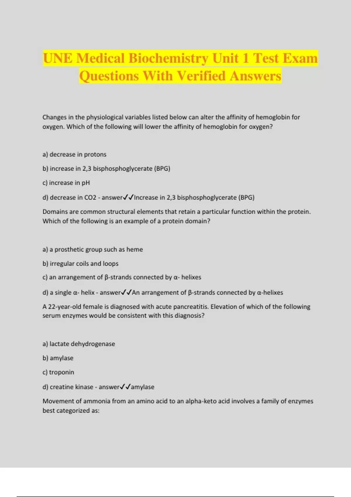 UNE Medical Biochemistry Unit 1 Test Exam Questions With Verified Answers