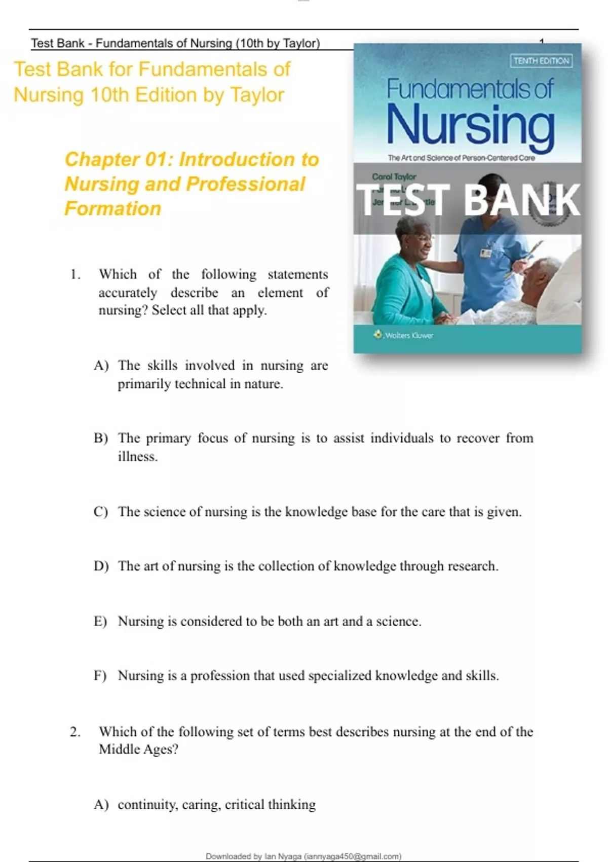 Test Bank - Fundamentals of Nursing (10th by Taylor) chapters package deal