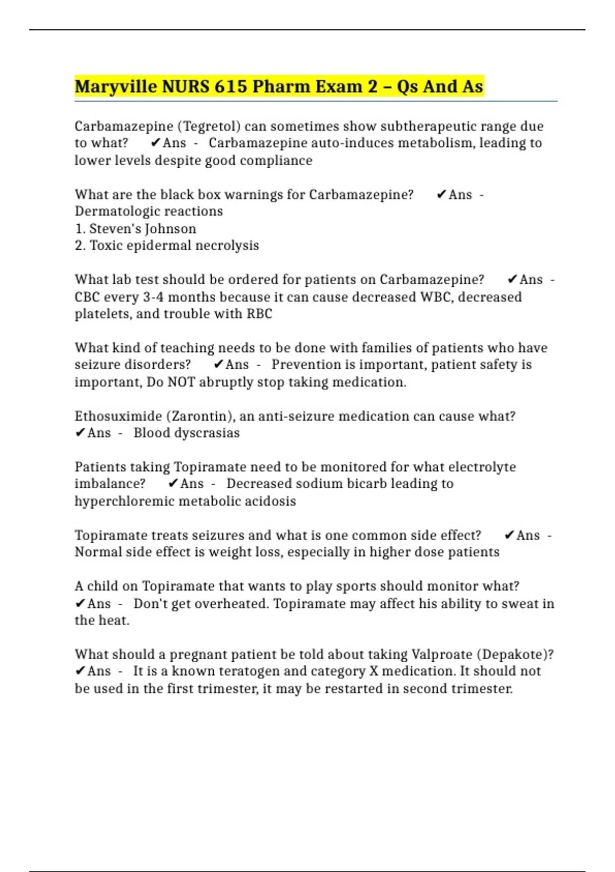 PACKAGE::- NURS 615 PHARMACOLOGY EXAMS - MARYVILLE UNIVERSITY